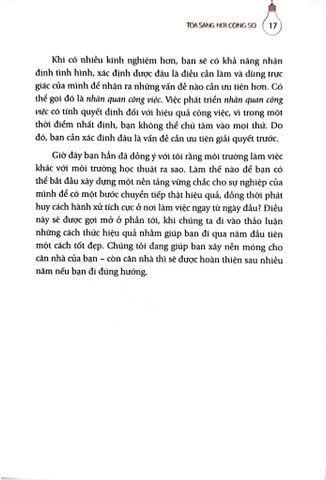 Bên cạnh cách tránh những sai lầm không đáng có, “Tỏa Sáng Nơi Công Sở” cũng đề cập đến những yếu tố khác có thể ảnh hưởng đến nền tảng sự nghiệp của bạn. Ở đại học, bạn là người trước tiên chịu trách nhiệm về bài vở và điểm số của mình. Nếu bạn đi học chuyên cần, hoàn thành tốt bài tập và bài thi thì bạn đã có thể tốt nghiệp. Tuy nhiên, trong môi trường làm việc, bạn sẽ cần đến sự giúp đỡ của nhiều người ở cả trong lẫn ngoài công ty để hoàn thành nhiệm vụ.