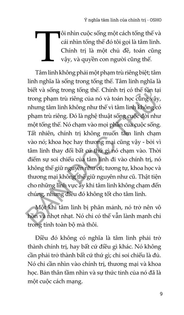 Cuốn sách Ý Nghĩa Tâm Linh Của Chính Trị của Osho phân tích mối quan hệ giữa tâm linh và chính trị, khuyến khích tư duy về cách con người có thể hướng đến sự công bằng, tự do và hòa hợp thông qua nhận thức cá nhân. Osho, với góc nhìn sâu sắc và khác biệt, đề cập đến vai trò của tâm linh trong việc định hình những giá trị cốt lõi của xã hội, đồng thời đặt ra câu hỏi về cách con người có thể vượt qua những rào cản truyền thống để xây dựng một thế giới cân bằng và nhân văn hơn.