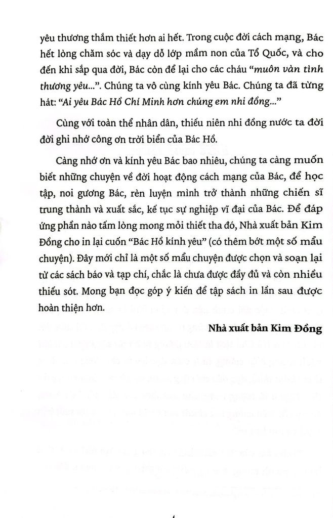 “Bác Hồ kính yêu” là tuyển tập những câu chuyện được chọn và soạn lại từ các sách báo và tạp chí viết về cuộc đời hoạt động cách mạng của Chủ tịch Hồ Chí Minh với mục đích giúp toàn thể nhân dân và các em thiếu niên nhi đồng noi theo gương Bác để học và rèn luyện, trở thành những chiến sĩ trung thành và xuất sắc kế tục sự nghiệp vĩ đại của dân tộc.