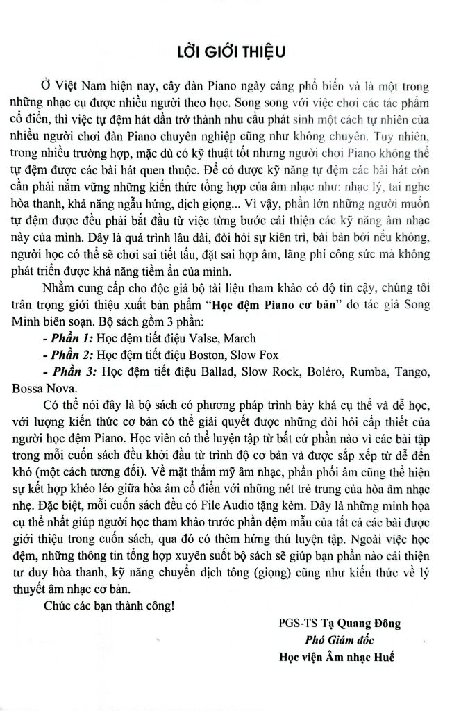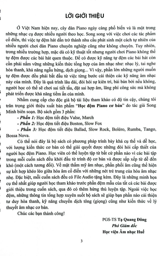 Với 3 tập trên nhằm cung cấp cho độc giả bộ tài liệu tham khảo có độ tin cậy, chúng tôi trân trọng giới thiệu xuất bản phẩm Học Đệm Piano Cơ Bản do tác giả Song Minh biên soạn.
