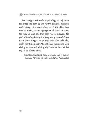 Tác phẩm đi sâu vào tác động của AI 5.0 trong việc cải thiện tốc độ, hiệu quả và độ chính xác trong quá trình ra quyết định. Cuốn sách cung cấp những phân tích về cách công nghệ AI đang thay đổi nhiều ngành công nghiệp và hướng dẫn cách tận dụng tiềm năng của nó để đổi mới và phát triển.