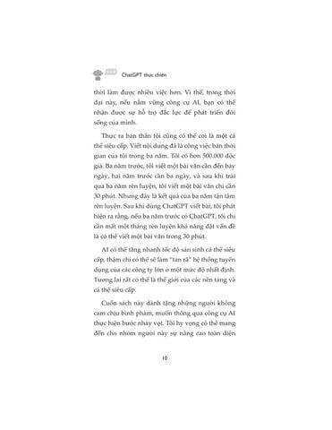Cuốn sách hướng dẫn cách sử dụng ChatGPT một cách hiệu quả để nâng cao hiệu suất công việc và ứng dụng trong nhiều lĩnh vực khác nhau. Người đọc sẽ khám phá cách tối ưu hóa khả năng của AI để tạo nội dung, xử lý dữ liệu và hỗ trợ trong các tác vụ sáng tạo.