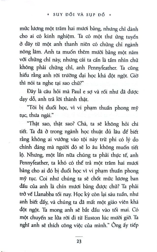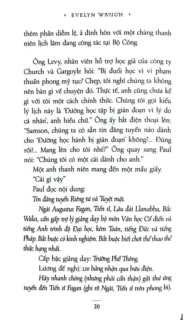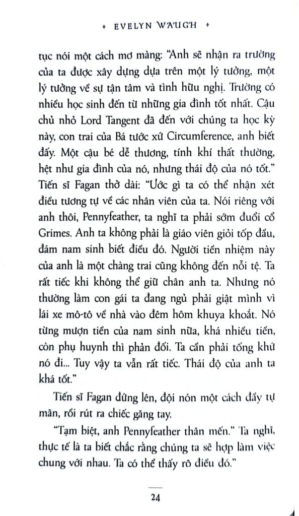 Các đồng nghiệp của Paul là một nhóm những kẻ lạc thời, trong đó có ông mục sư già Prendy bị nỗi hoài nghi về Đấng cứu thế giày vò và gã đồng nghiệp Captain Grimes thường xuyên bị “tai bay vạ gió”. Tại Trường Llanabba, Paul bị thu hút bởi Quý bà Margot Beste-Chetwynde, một góa phụ giàu có, đồng thời là mẹ của một trong những học sinh do anh dạy dỗ. Paul vỡ òa niềm vui sướng khi được bà Margot Beste-Chetwynde thuê làm gia sư cho con trai trong kỳ nghỉ. Chuyển đến sống tại một căn biệt thự sang trọng, Paul dần dà nhận ra thói quen sống phóng túng của bà phụ huynh này.
