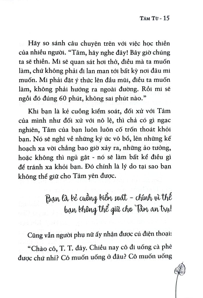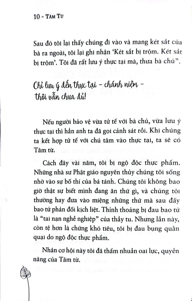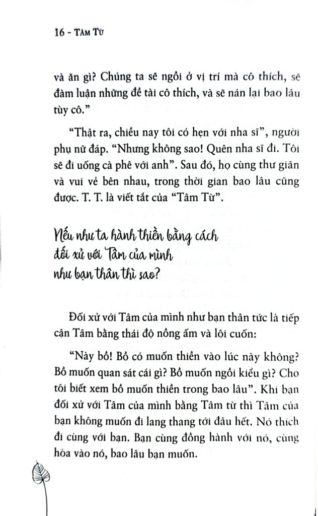 Thông qua những câu chuyện và những hướng dẫn đi vào trọng tâm, quyển sách giới thiệu với quý vị về Tâm từ và hướng dẫn cho quý vị một phương pháp luyện tập mạnh mẽ mà tôi gọi là “hơi thở đẹp”. Phương pháp luyện tập được từ từ gợi mở theo từng giai đoạn thời gian – tôi sẽ hướng dẫn chi tiết năm giai đoạn tinh tế cho hành thiền diễn ra. Chúng ta có thể rèn luyện hầu nhận thức về Tâm từ càng ngày càng sâu sắc qua mỗi giai đoạn. Hòa trộn hơi thở đẹp với thần thái yêu thương khoảnh khắc hiện tại nằm trong phần luyện Tâm từ, hun đúc cho bạn khả năng yêu thương chăm sóc lẫn nhau – bằng cách tử tế chăm sóc chính Tâm của mình, chúng ta cùng nhau kết thành một lực lượng yêu thương, trắc ẩn mãi mãi trường tồn trên thế gian.
