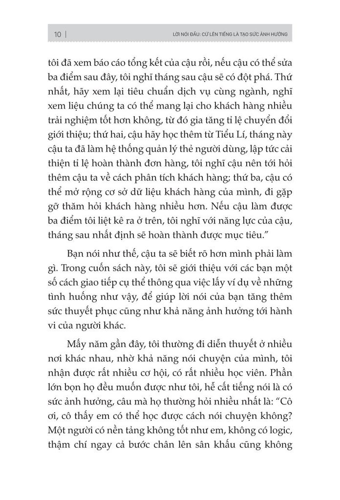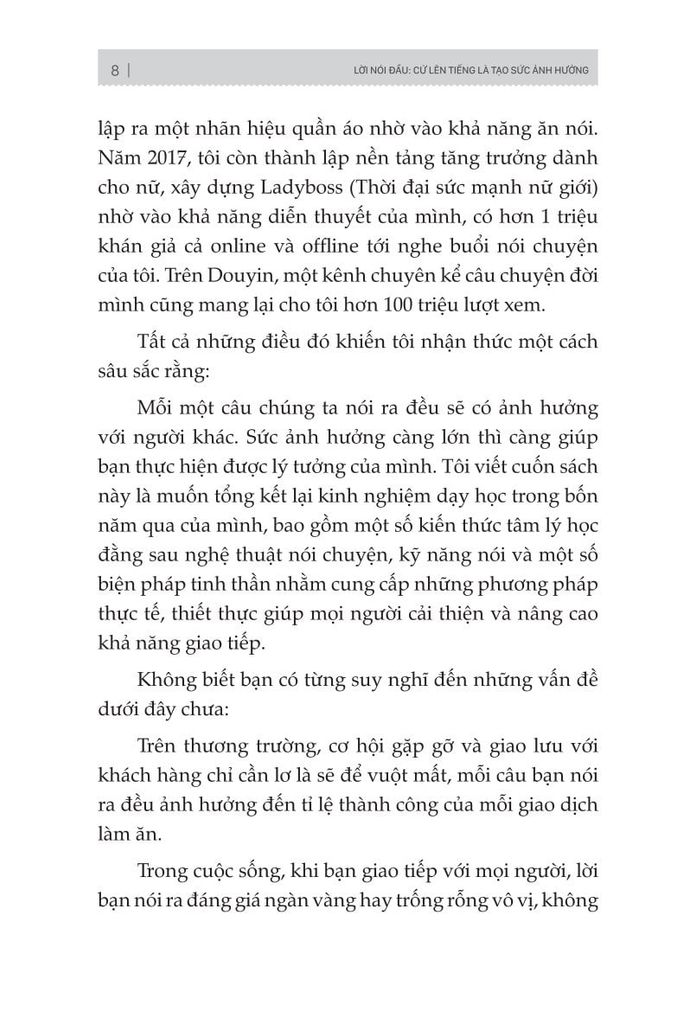 Đáp án của những câu hỏi trên đều có trong cuốn sách này. “Cứ lên tiếng là tạo sức ảnh hưởng" là cuốn "tâm pháp” thực tiễn về giao tiếp của diễn giả siêu cấp Lý Uyển Cầm.