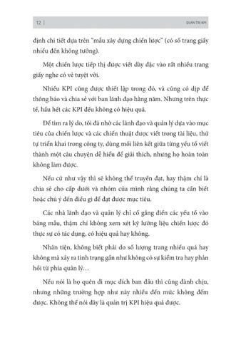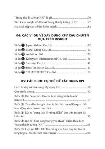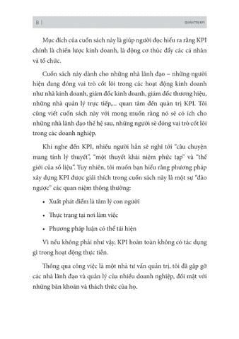 Chính vì vậy, cuốn sách này cung cấp cho bạn một phương pháp hiệu quả hơn, đó là, xây dựng KPI dựa trên mục tiêu. Phương pháp này giúp bạn xây dựng KPI nhanh hơn, dễ dàng hơn và đạt được hiệu quả cao hơn qua các nội dung chi tiết.