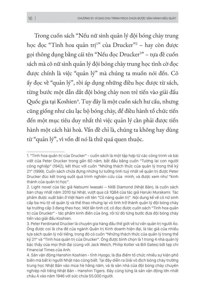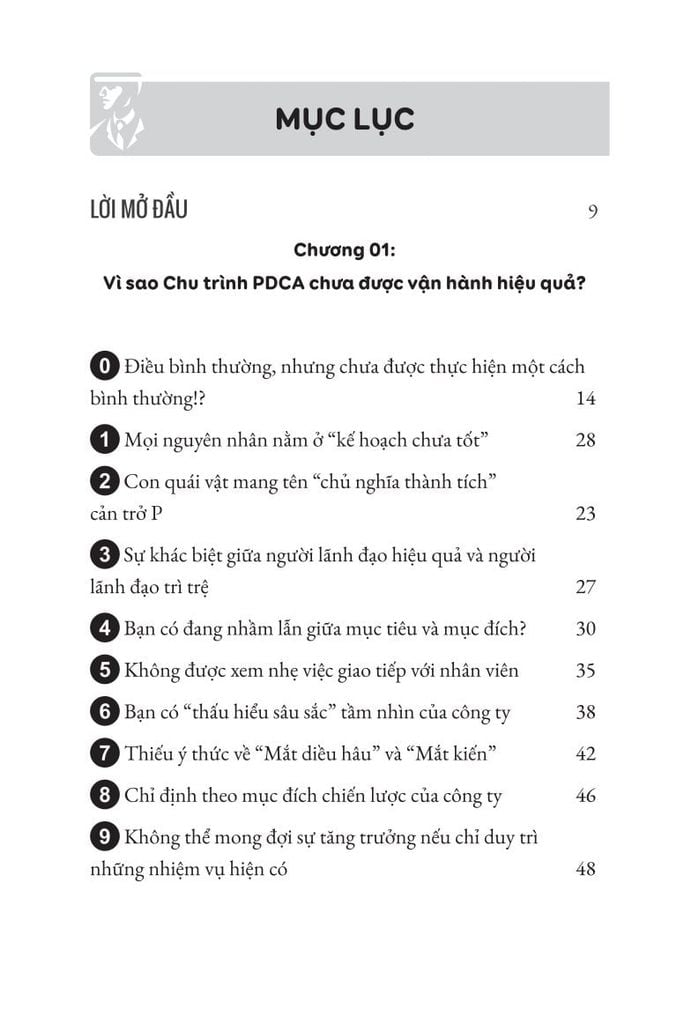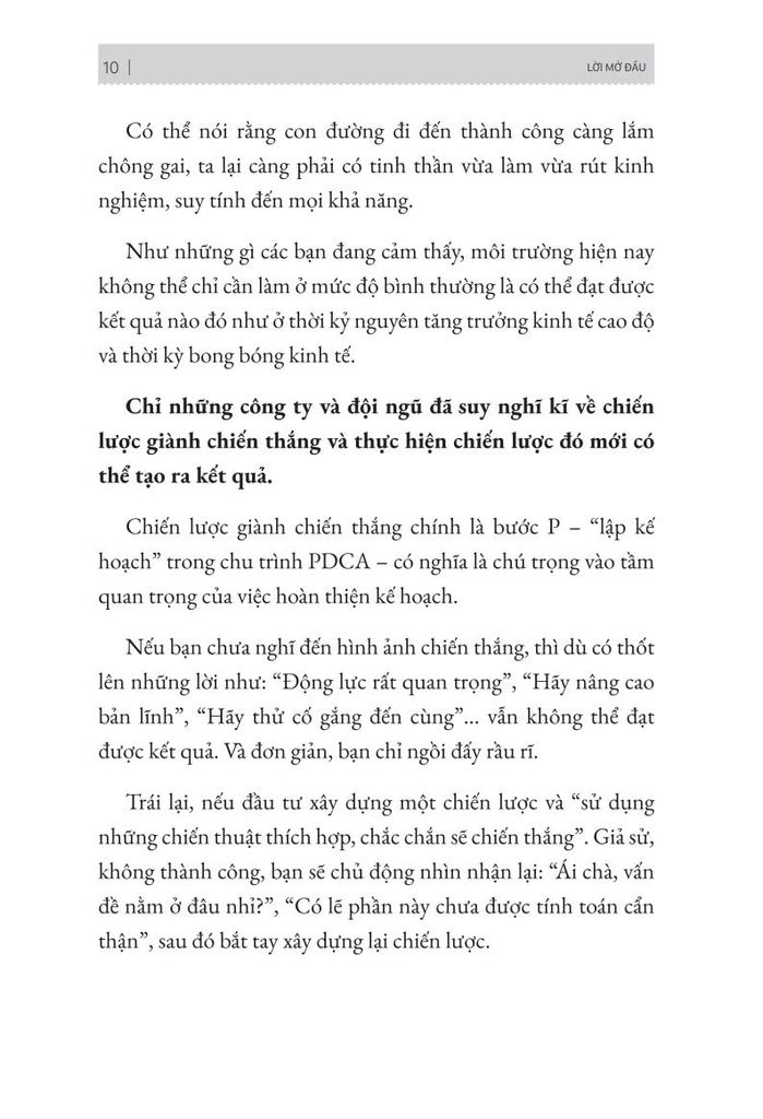 PDCA – viết tắt của Plan – Kế hoạch; Do – Thực thi; Check – Kiểm tra; Act – Hành động, là một công cụ quản lý dự án 4 bước để thực hiện cải tiến liên tục. Nếu bạn không sử dụng bộ công cụ PDCA, rất nhiều những đối thủ cạnh tranh sẽ áp dụng nó và đạt được lợi thế cho doanh nghiệp. Cuốn sách này sẽ giúp bạn có được lợi thế cạnh tranh thông qua việc áp dụng công thức phát triển và cải tiến.