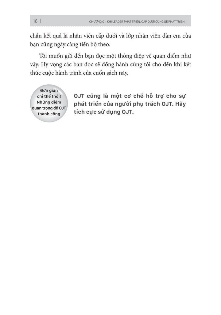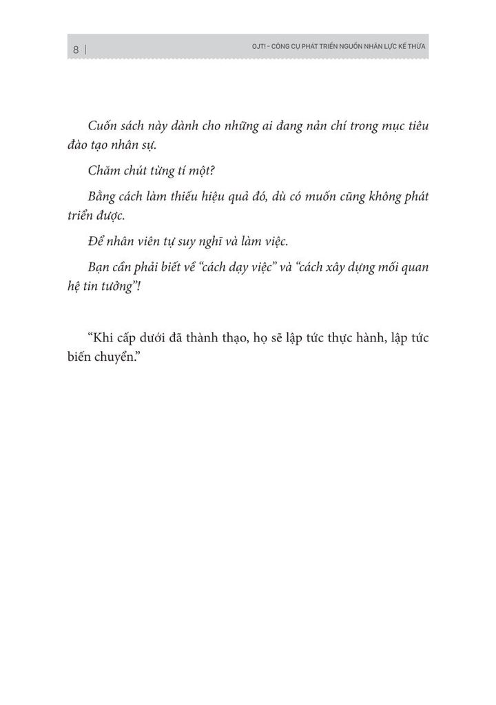 Doanh nghiệp nào cũng cần áp dựng công cụ phát triển nguồn nhân lực kế thừa. OJT viết tắc của On the job training, nghĩa là đào tạo nguồn nhân lực tại chỗ. Cuốn sách cung cấp một giải pháp và công thức giúp nhà lãnh đạo có thể tạo ra đội ngũ nhân viên chất lượng, gắn bó lâu dài và mang lại hiệu suất làm việc tốt.