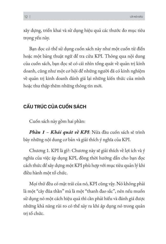 Cuốn sách đưa ra khái quát về KPI và những câu chuyện thực tế về KPI bất kỳ doanh nghiệp Châu Á nào cũng từng gặp phải. Tiếp theo, đưa ra chi tiết cách xây dựng – triển khai – đo lường – điều chỉnh KPI cho từng phòng ban trong công ty theo cơ chết khoán.