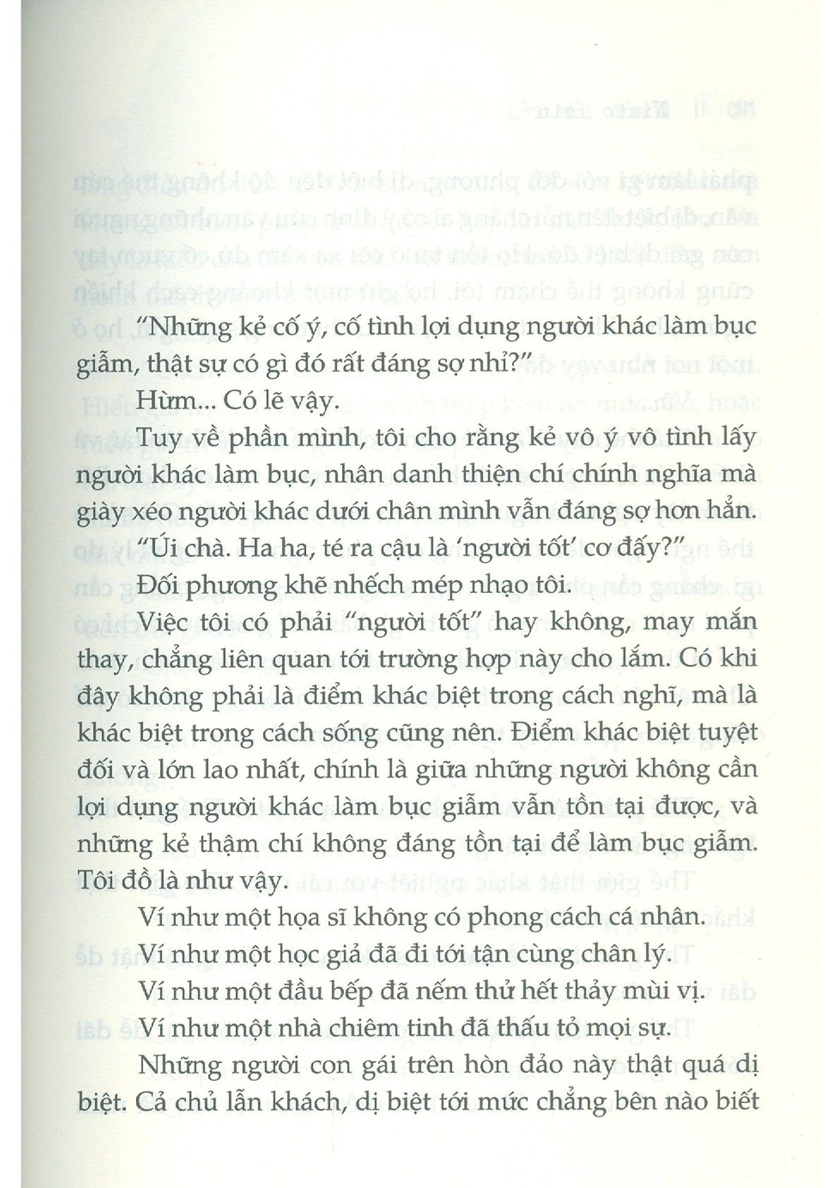 Những nhân vật xuất hiện trong chuyến đi mạo hiểm này đều là những con người vụn vỡ. Tất thảy đều mâu thuẫn khôn cùng, suy sụp khôn cùng, sụp đổ tới tận cùng. Chắc hẳn họ đã bị hủy hoại. Nhưng riêng kẻ thích bông đùa tôi đây thậm chí còn chẳng được ban ân huệ ấy. Bởi bạn thấy đấy, ngay từ đầu tôi đã chẳng lành lặn rồi...