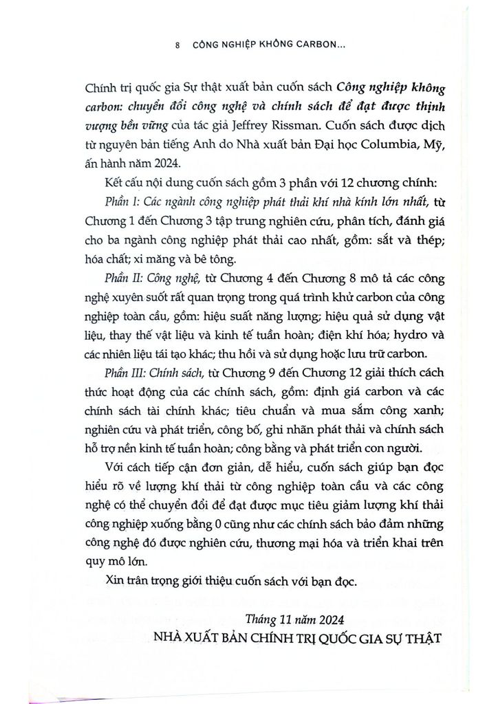Công Nghiệp Không Carbon: Chuyển Đổi Công Nghệ Và Chính Sách Để Đạt Được Thịnh Vượng Bền Vững - Jeffrey Rissman Cuốn sách mở ra một tầm nhìn đột phá về tương lai của công nghiệp, nơi các quá trình sản xuất không còn phải phụ thuộc vào carbon, giúp bảo vệ hành tinh và tạo ra cơ hội thịnh vượng bền vững, trong bối cảnh khủng hoảng biến đổi khí hậu ngày càng nghiêm trọng.