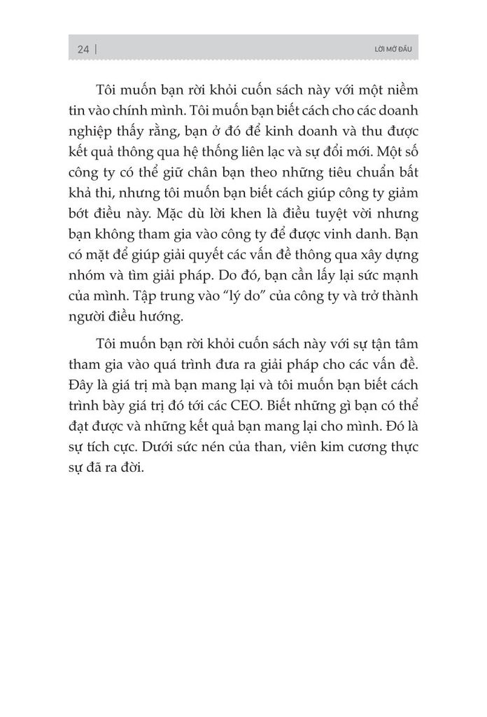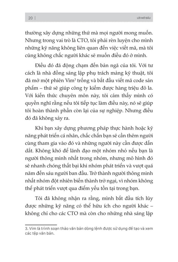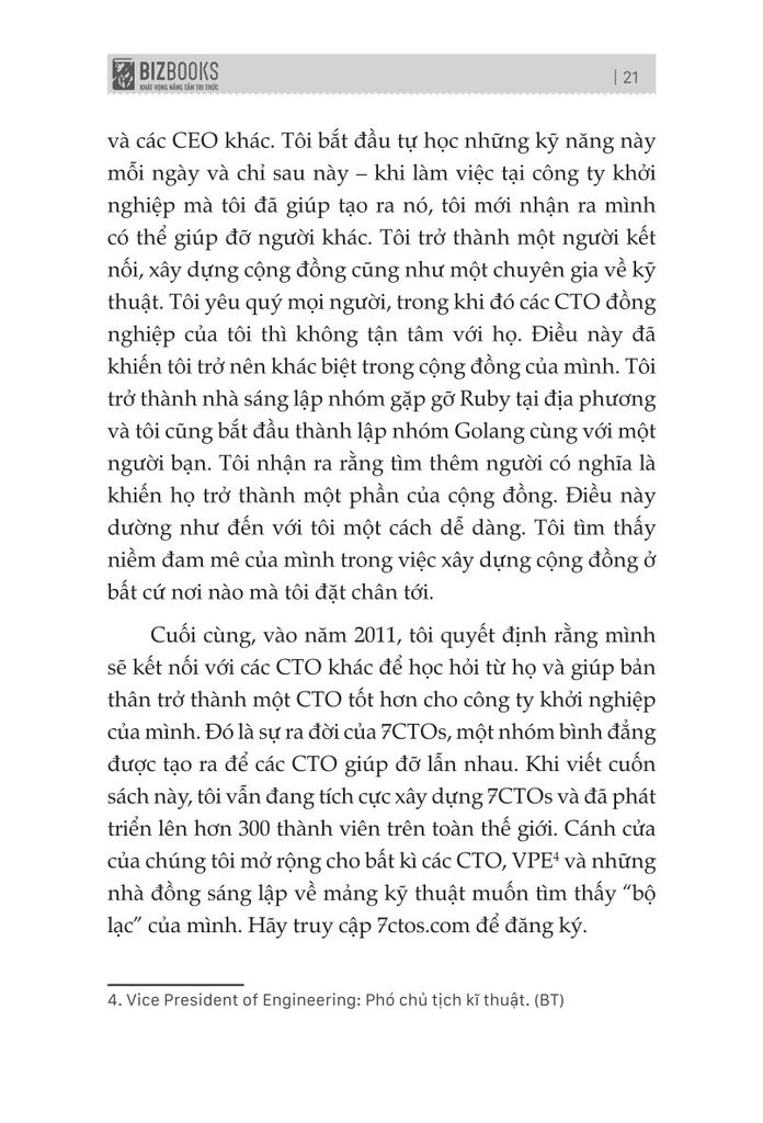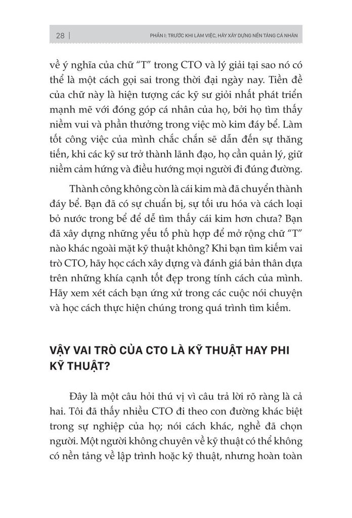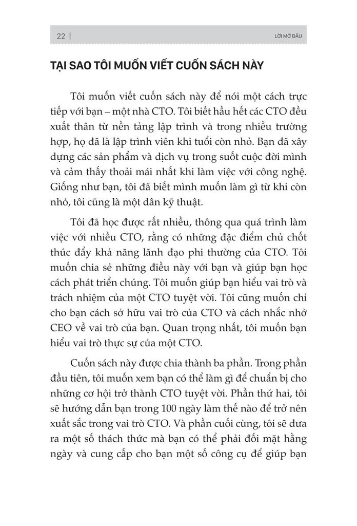 Cuốn sách sẽ hỗ trợ bạn cách loại bỏ những “khuôn mẫu” và tiếp cận công việc từ một khía cạnh khác, thảo luận mối liên hệ giữa CTO và CEO, sự lựa chọn nhiều hướng để đến được nơi bạn cần đến, cho cá nhân bạn và cả công ty, và cách điều hướng ban lãnh đạo để nuôi dưỡng không chỉ những ý tưởng tốt nhất.