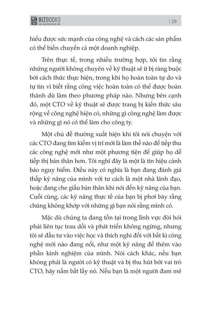 Một CTO được kỳ vọng là người có các kỹ năng mềm và kỹ năng cứng vượt trội, cùng khả năng nắm bắt khoa học công nghệ thông tin xuất sắc. Bạn đã sẵn sàng để trở thành một CTO? – Một người tiên phong công nghệ trong tất cả các khía cạnh của doanh nghiệp, cân bằng nhu cầu của nhân viên, người dùng (hay khách hàng) và các bên liên quan có chung lợi ích. Bizbooks hy vọng bạn sẽ trở thành một CTO xuất sắc, tất cả những người làm việc với bạn đều sẽ được truyền cảm hứng làm việc tích cực hơn.