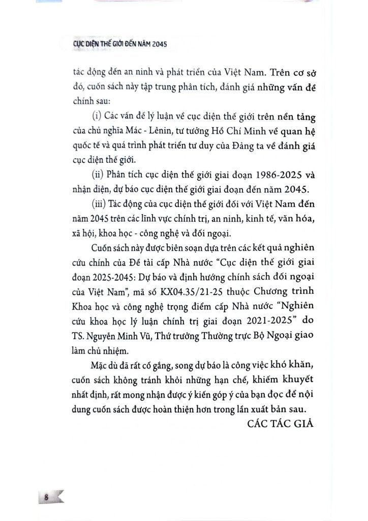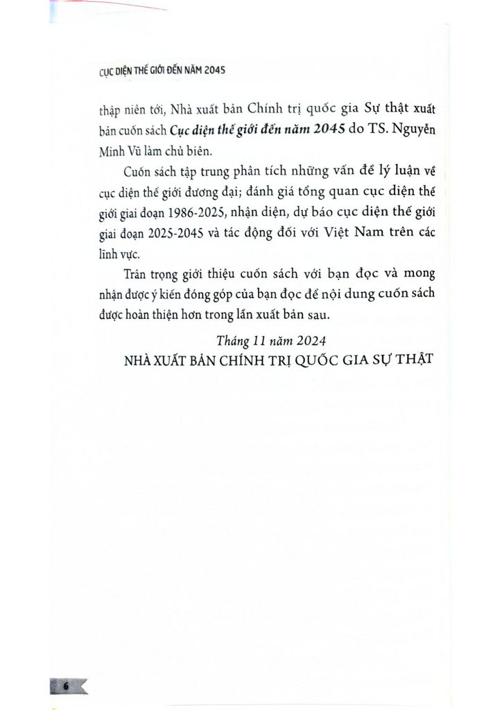 Nhằm cung cấp cho bạn đọc tài liệu nghiên cứu, tham khảo về cục diện thế giới và sự vận động của nó trong những thập niên tới, Nhà xuất bản Chính trị quốc gia Sự thật xuất bản cuốn sách Cục diện thế giới đến năm 2045 do TS. Nguyễn Minh Vũ làm chủ biên.