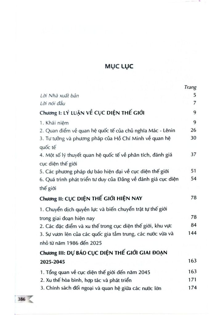 Cuốn sách tập trung phân tích những vấn đề lý luận về cục diện thế giới đương đại; đánh giá tổng quan cục diện thế giới giai đoạn 1986-2025, nhận diện, dự báo cục diện thế giới giai đoạn 2025-2045 và tác động đối với Việt Nam trên các lĩnh vực.