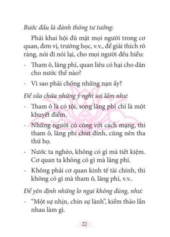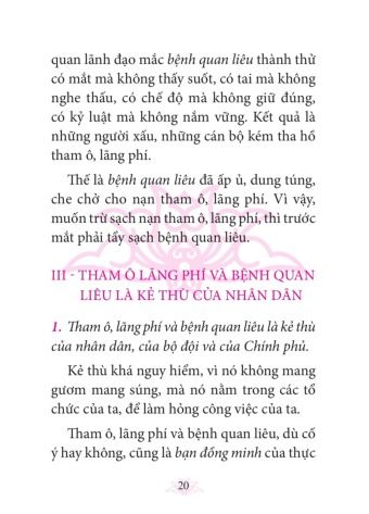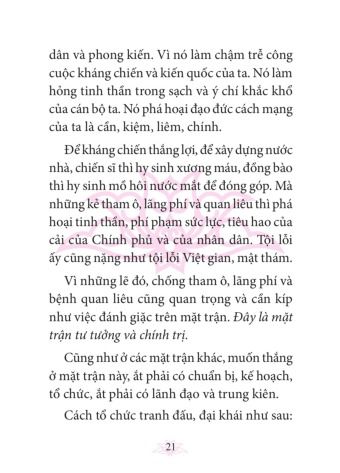 Từ sự phân tích sâu sắc những biểu hiện, bản chất, nội dung, nguồn gốc của tham ô, lãng phí, quan liêu, Hồ Chí Minh còn đề ra những biện pháp nhằm chống các căn bệnh tệ hại này một cách có hiệu quả: Một là, phải tăng cường công tác giáo dục chính trị, tư tưởng, rèn luyện đạo đức cách mạng cho cán bộ, đảng viên và nhân dân. Hai là, phải dựa vào quần chúng, phát động quần chúng tích cực tham gia đấu tranh chống tham ô, lãng phí, quan liêu và thực hành tiết kiệm. Ba là, phải hoàn thiện bộ máy quản lý nhà nước, đào tạo và nâng cao trình độ của đội ngũ cán bộ. Bốn là, phải tăng cường công tác quản lý, kiểm tra, thanh tra và xử lý kỷ luật nghiêm minh những tập thể, cá nhân vi phạm. Năm là, thường xuyên chỉnh đốn đội ngũ cán bộ, đảng viên. Để thực hiện có hiệu quả cần coi trọng và tiến hành đồng bộ các biện pháp. Người còn yêu cầu: “Mỗi cán bộ, đảng viên phải đặt lợi ích của cách mạng, của Đảng của nhân dân lên trên hết, trước hết. Phải kiên quyết nâng cao đạo đức cách mạng, quét sạch chủ nghĩa cá nhân, bồi dưỡng tư tưởng tập thể, tinh thần đoàn kết, tính tổ chức và tính kỷ luật”.