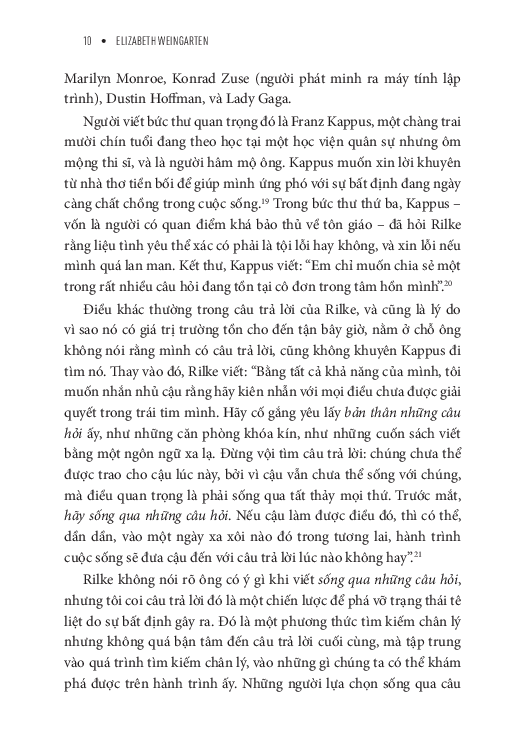 Giữa một thời đại mà con người mải mê đi tìm câu trả lời nhanh chóng, dễ dàng và áp dụng được với mọi trường hợp, cuốn sách này tiết lộ cho bạn một hướng đi mới đầy sáng suốt nhưng táo bạo: học cách đón nhận những câu hỏi. Và bạn có thể biến câu hỏi từ thứ khiến mình đau đáu thành người dẫn đường cho bạn. Pha trộn giữa chất thơ, trải nghiệm cá nhân và những hiểu biết từ khoa học hành vi, cuốn sách giúp bạn xây dựng một mối quan hệ sâu sắc, có chủ đích hơn với sự bất định – không hứa hẹn một lời giải đáp cuối cùng, mà hứa hẹn sự thay đổi nội tại.