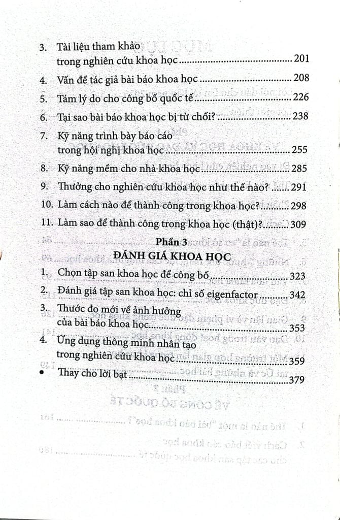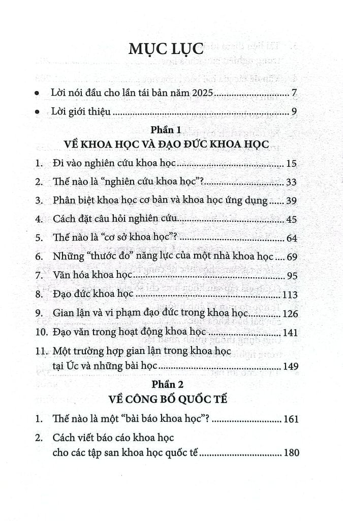 Cuốn sách này ra đời trên cơ sở tập hợp những bài viết về hai nội dung chính: nghiên cứu khoa học và việc công bố kết quả nghiên cứu khoa học. Trong phần đầu, tác giả cố gắng làm rõ các khái niệm cốt yếu như “hoạt động nghiên cứu khoa học”, “cơ sở khoa học”, cách xác định đề tài nghiên cứu, vấn đề đạo đức khoa học, văn hóa khoa học… Về phương diện công bố kết quả nghiên cứu khoa học, tác giả chủ yếu tập trung vào hình thức bài báo khoa học đăng trên tập san quốc tế.