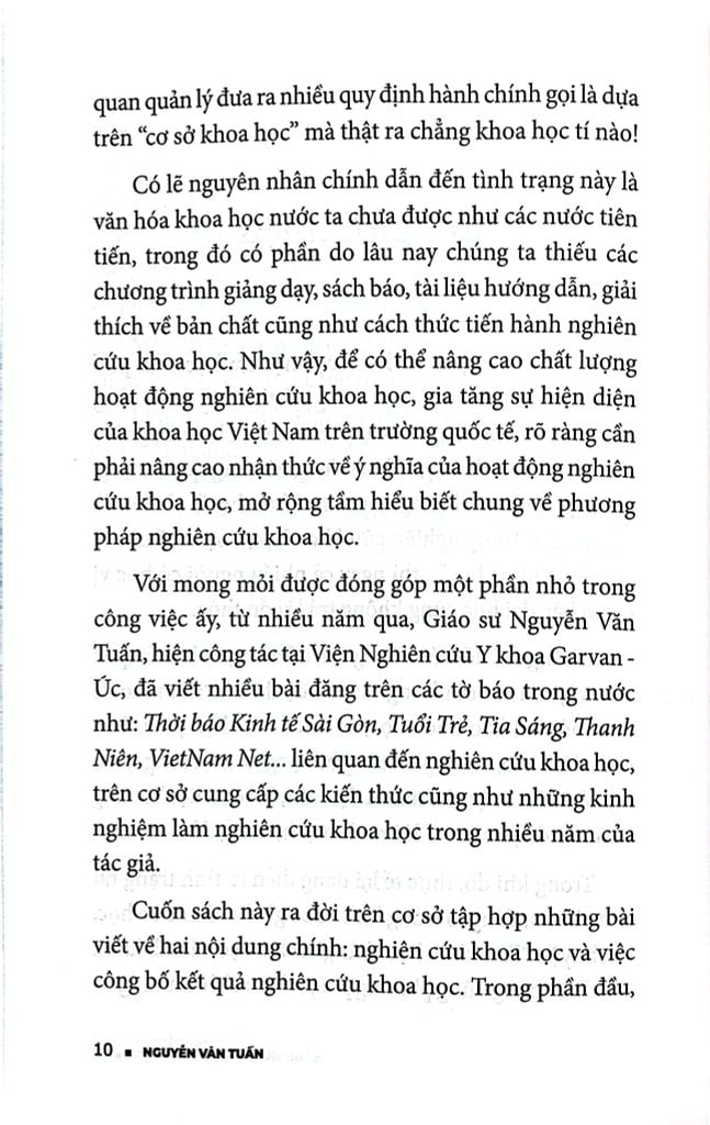 Với mong mỏi được đóng góp một phần nhỏ trong công việc ấy, từ nhiều năm qua, Giáo sư Nguyễn Văn Tuấn, hiện công tác tại Viện nghiên cứu Y khoa Garvan - Úc, đã viết nhiều bài đăng trên các tờ báo trong nước như: Thời báo Kinh tế Sài Gòn, Tuổi Trẻ, Tia Sáng, Thanh Niên, VietNam Net… liên quan đến nghiên cứu khoa học, trên cơ sở cung cấp các kiến thức cũng như những kinh nghiệm làm nghiên cứu khoa học trong nhiều năm của tác giả.