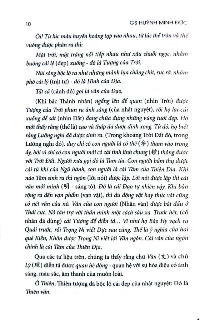 (Khi bậc Thánh nhân) ngẩng lên để quan (nhìn Trời) được Tượng của Trời phun ra ánh sáng (của nhật nguyệt), rồi họ lại cúi xuống để sát (nhìn Đất) đang chứa đựng những vùng tươi đẹp. Họ mới thấy rằng (thế là) cao và thấp đã được định xong. Từ đó, họ biết rằng Lưỡng nghi đã được sinh ra. (Trong khoảng Trời Đất đó, trong Lưỡng nghi đó), duy chỉ có con người là có thể (參) tham vào trong ấy, bởi vì chỉ có con người mới có cái tính linh chung (鍾) thông được với Trời Đất. Người xưa gọi đó là Tam tài. Con người bẩm thụ được cái tú khí của Ngũ hành, con người là cái Tâm của Thiên Địa. Khi nào Tâm sinh ra thì ngôn (lời nói) được lập. Lời nói được lập thì cái văn mới minh (明 - sáng tỏ). Đó là cái Đạo tự nhiên vậy. Khi bàn rộng ra đến vạn phẩm (vạn vật), thì dù động vật hay thực vật cũng có nét văn của nó. Văn của con người (Nhân văn) được bắt đầu ở Thái cực. Nó tán trợ với thần minh một cách sâu xa. Trước hết, (cổ nhân đã dùng) cái Tượng để diễn tả… Ví như họ Bào Hy vạch ra Quái trước, rồi Trọng Ni viết Dực sau cùng. Thế là ý nghĩa của hai quẻ Kiền, Khôn được Trọng Ni viết lời Văn ngôn. Cái văn của ngôn chính là cái Tâm của Thiên Địa.