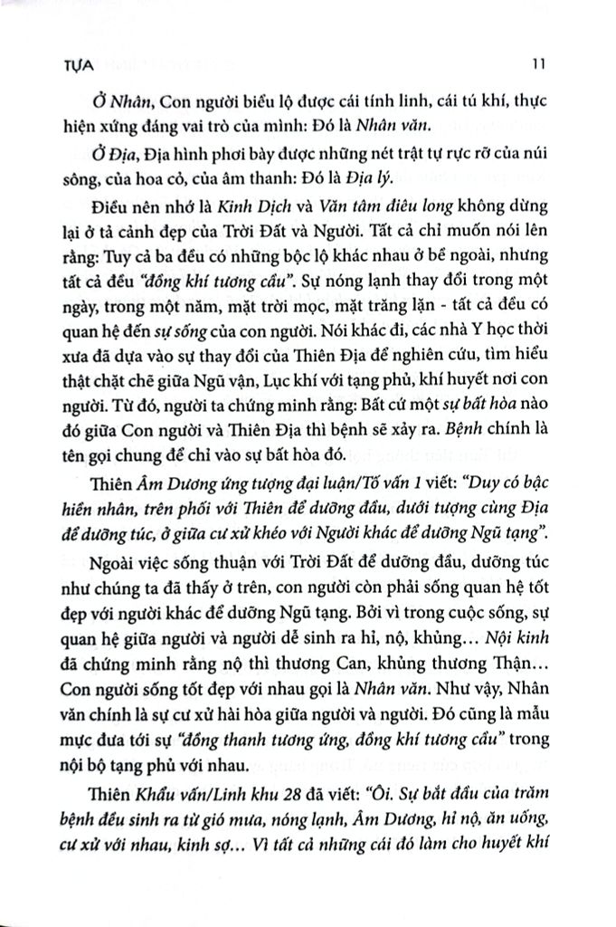 Điều nên nhớ là Kinh Dịch và Văn tâm điêu long không dừng lại ở tả cảnh đẹp của Trời Đất và Người. Tất cả chỉ muốn nói lên rằng: Tuy cả ba đều có những bộc lộ khác nhau ở bề ngoài, nhưng tất cả đều “đồng khí tương cầu”. Sự nóng lạnh thay đổi trong một ngày, trong một năm, mặt trời mọc, mặt trăng lặn - tất cả đều có quan hệ đến sự sống của con người. Nói khác đi, các nhà Y học thời xưa đã dựa vào sự thay đổi của Thiên Địa để nghiên cứu, tìm hiểu thật chặt chẽ giữa Ngũ vận, Lục khí với tạng phủ, khí huyết nơi con người. Từ đó, người ta chứng minh rằng: Bất cứ một sự bất hòa nào đó giữa Con người và Thiên Địa thì bệnh sẽ xảy ra. Bệnh chính là tên gọi chung để chỉ vào sự bất hòa đó.