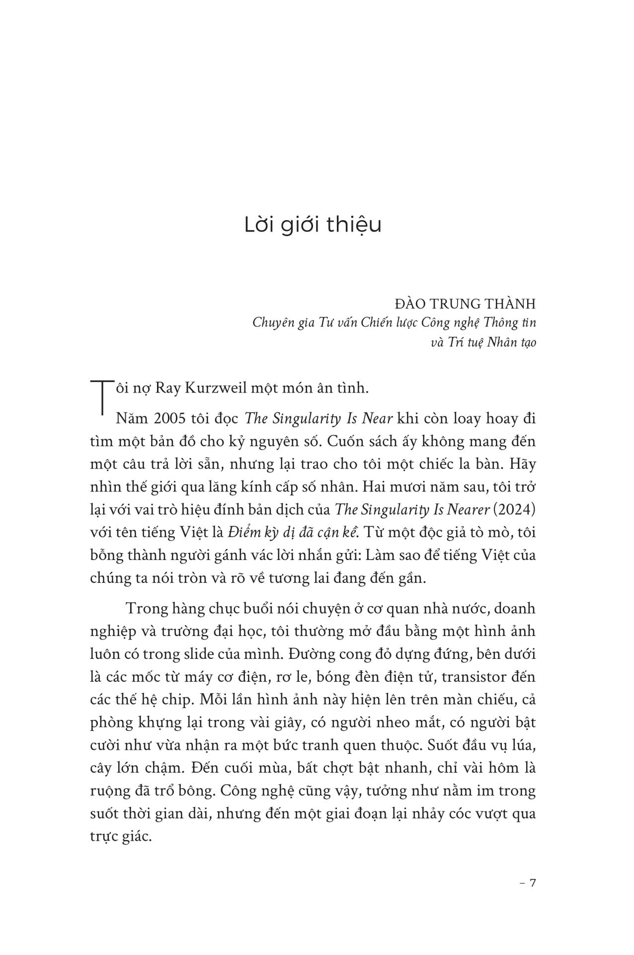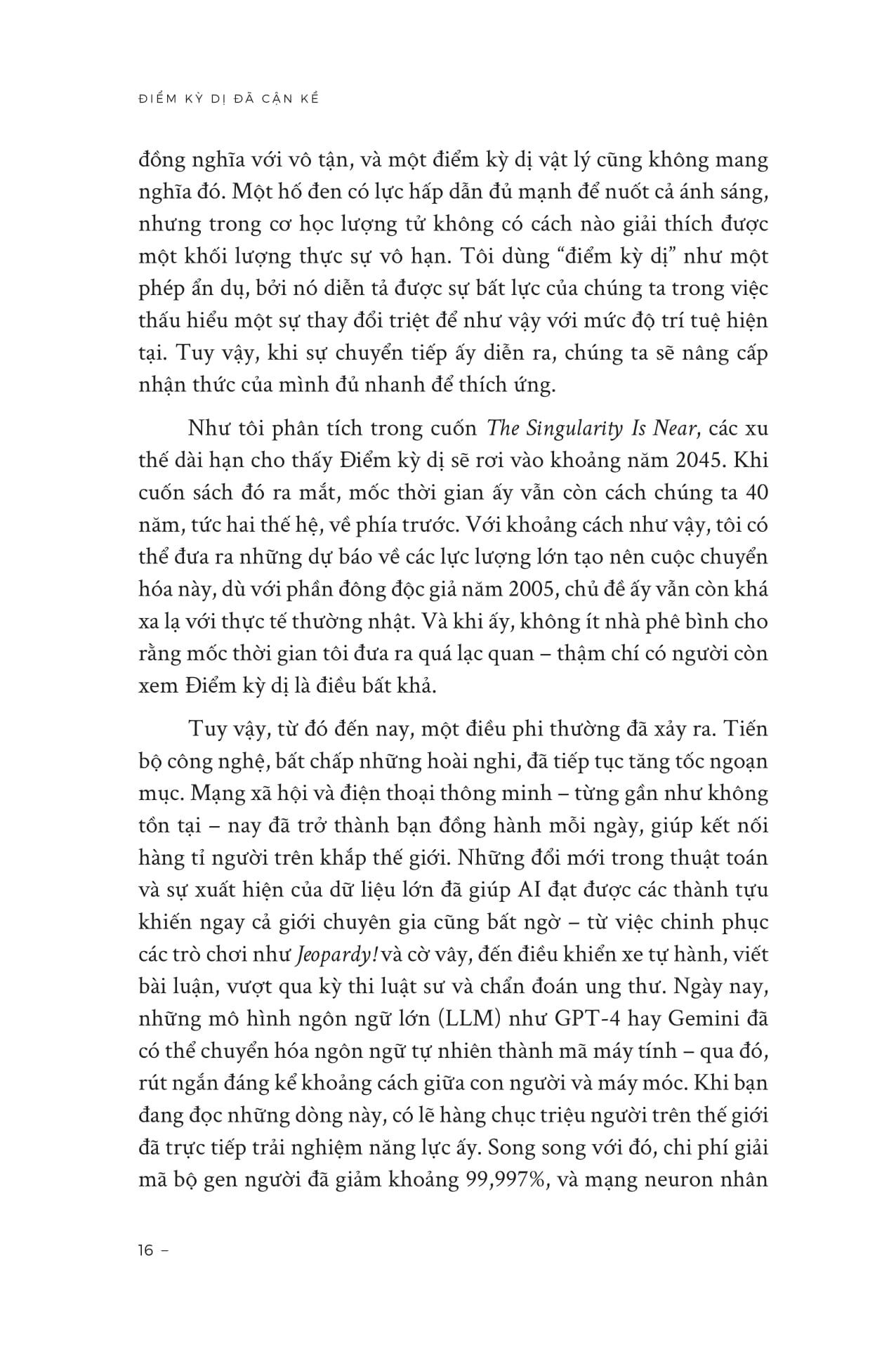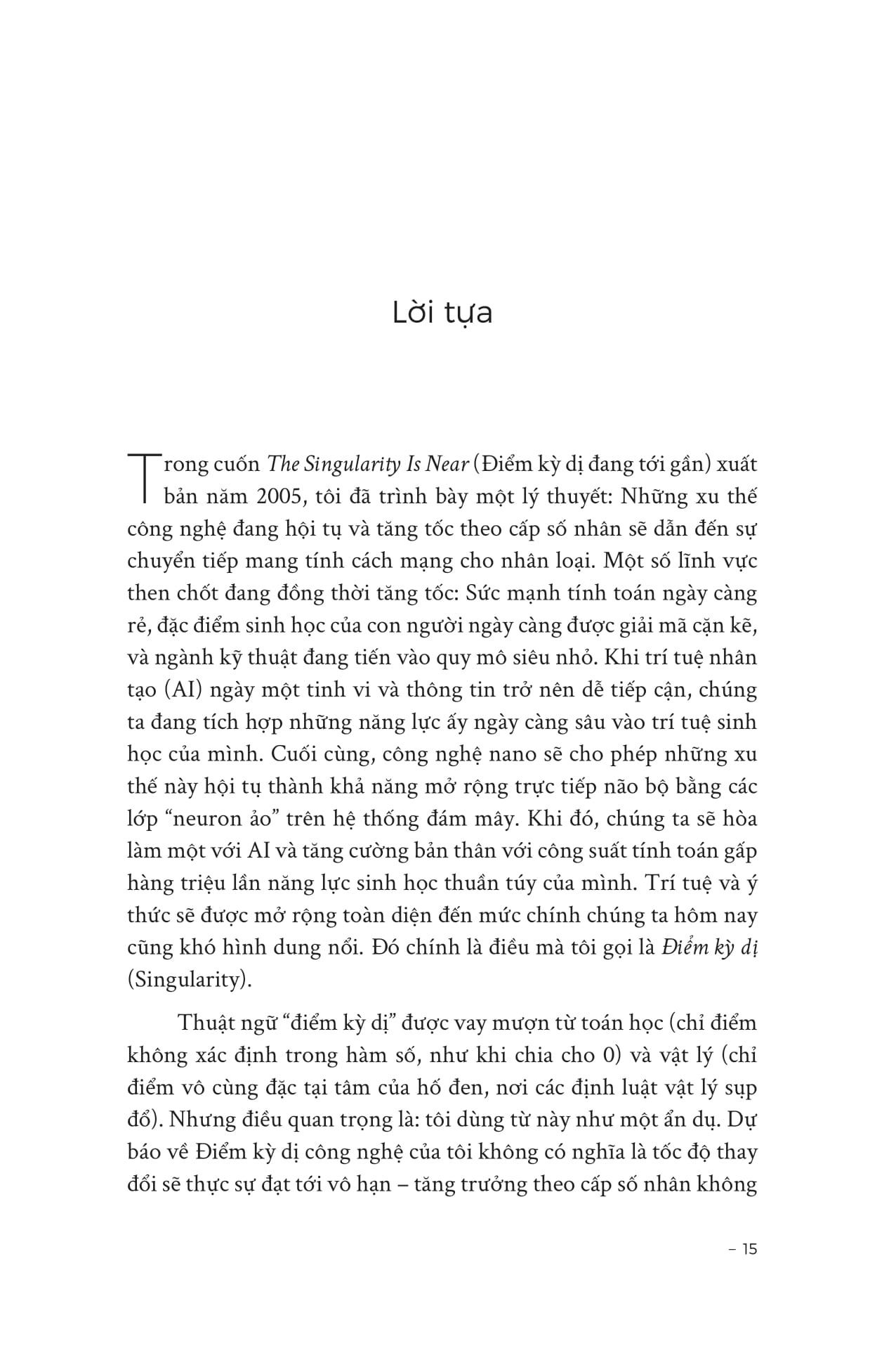 “Những xu thế công nghệ đang hội tụ và tăng tốc theo cấp số nhân sẽ dẫn đến sự chuyển tiếp mang tính cách mạng cho nhân loại. Một số lĩnh vực then chốt đang đồng thời tăng tốc: Sức mạnh tính toán ngày càng rẻ, đặc điểm sinh học của con người ngày càng được giải mã cặn kẽ, và ngành kỹ thuật đang tiến vào quy mô siêu nhỏ. Khi trí tuệ nhân tạo (AI) ngày một tinh vi và thông tin trở nên dễ tiếp cận, chúng ta đang tích hợp những năng lực ấy ngày càng sâu vào trí tuệ sinh học của mình. Cuối cùng, công nghệ nano sẽ cho phép những xu thế này hội tụ thành khả năng mở rộng trực tiếp não bộ bằng các lớp “neuron ảo” trên hệ thống đám mây. Khi đó, chúng ta sẽ hòa làm một với AI và tăng cường bản thân với công suất tính toán gấp hàng triệu lần năng lực sinh học thuần túy của mình. Trí tuệ và ý thức sẽ được mở rộng toàn diện đến mức chính chúng ta hôm nay cũng khó hình dung nổi. Đó chính là điều mà tôi gọi là Điểm kỳ dị (Singularity).”