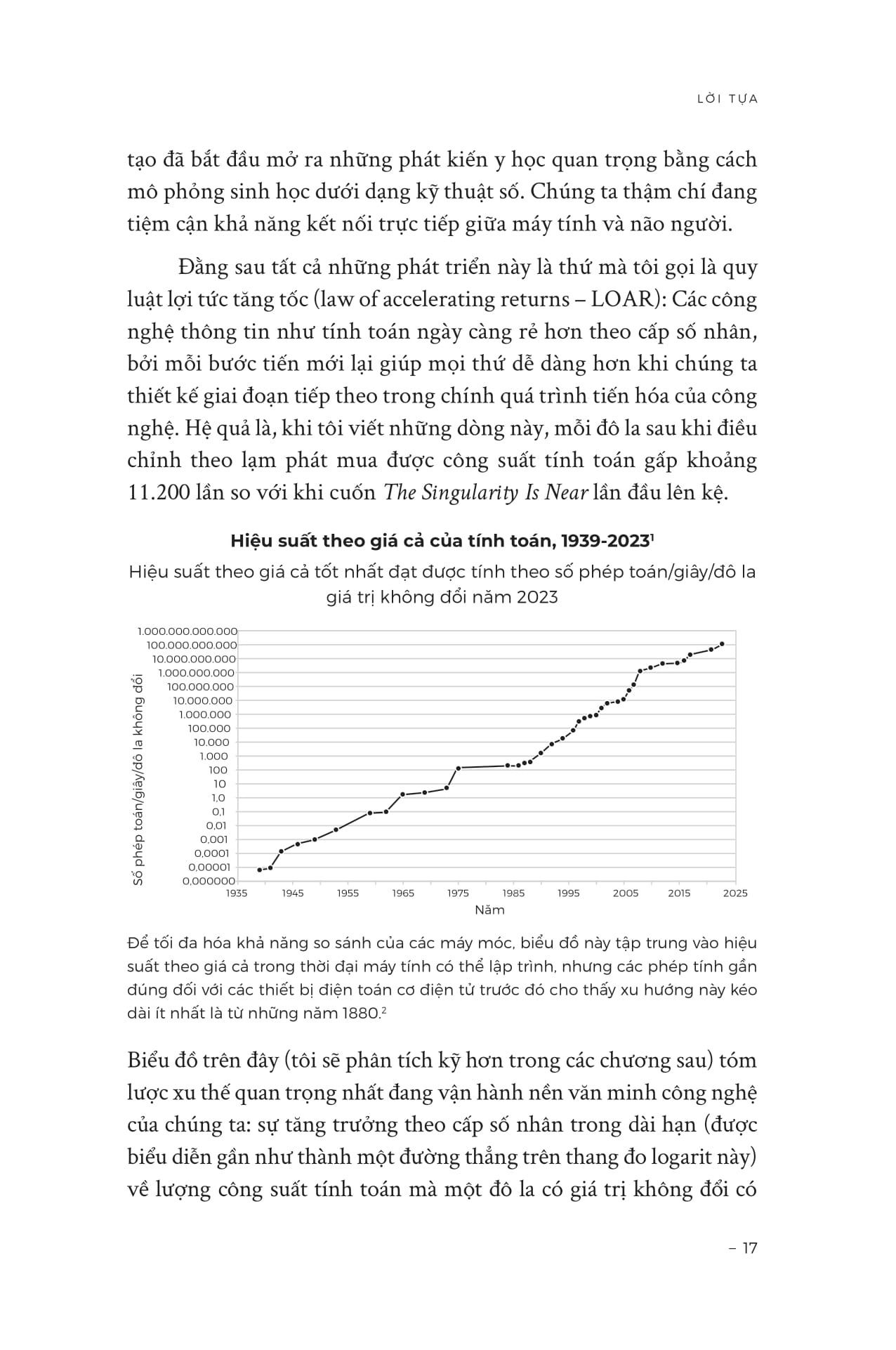 “Các công nghệ thông tin như tính toán ngày càng rẻ hơn theo cấp số nhân, bởi mỗi bước tiến mới lại giúp mọi thứ dễ dàng hơn khi chúng ta thiết kế giai đoạn tiếp theo trong chính quá trình tiến hóa của công nghệ. Hệ quả là, khi tôi viết những dòng này, mỗi đô la sau khi điều chỉnh theo lạm phát mua được công suất tính toán gấp khoảng 11.200 lần so với khi cuốn The Singularity Is Near lần đầu lên kệ.”