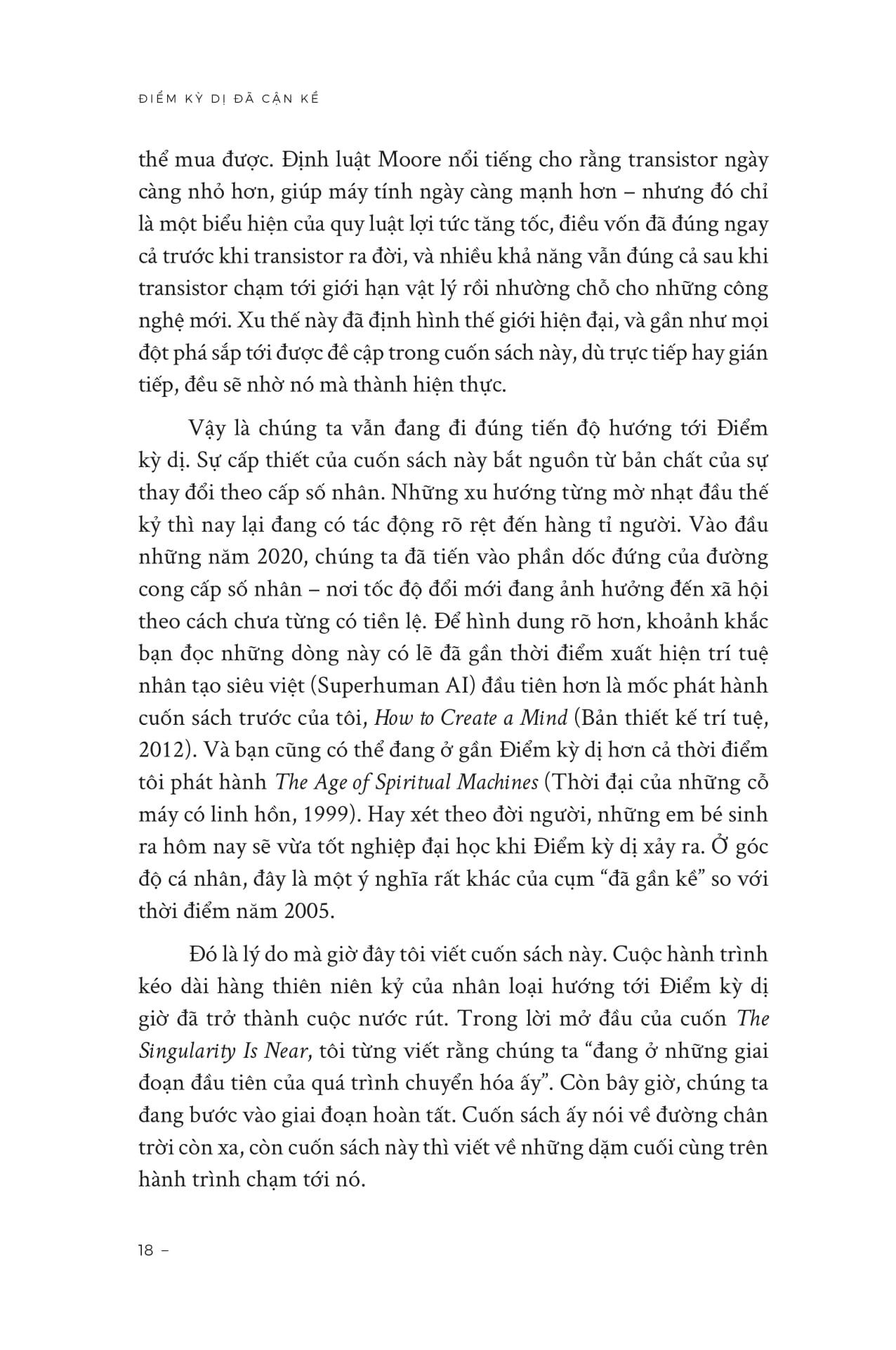 Trong cuốn sách này, Kurzweil dẫn dắt độc giả đi tiếp trên hành trình mà ông bắt đầu từ “The Singularity Is Near” (2005), nhưng với dữ liệu mới, những cập nhật công nghệ, và sự tự tin lớn hơn rằng những mốc từng dự đoán giờ đang dần trở thành hiện thực.