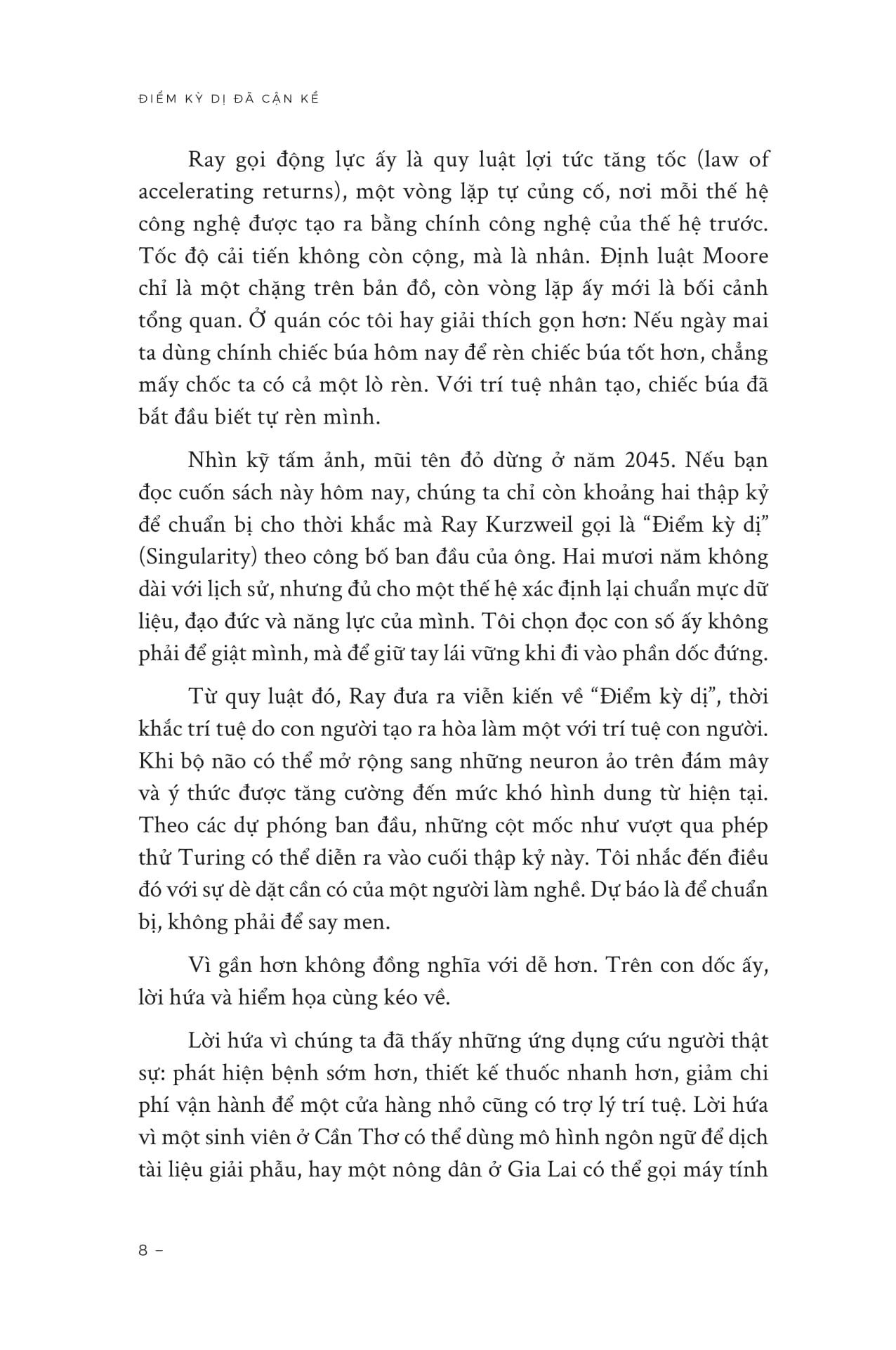 Cuốn sách phát đi tín hiệu rằng chúng ta không còn chờ đợi một viễn cảnh tương lai xa xôi: Thời điểm mà Ray Kurzweil gọi là Điểm kỳ dị (Singularity), khi con người và máy móc hợp nhất, đang đến gần hơn bao giờ hết.