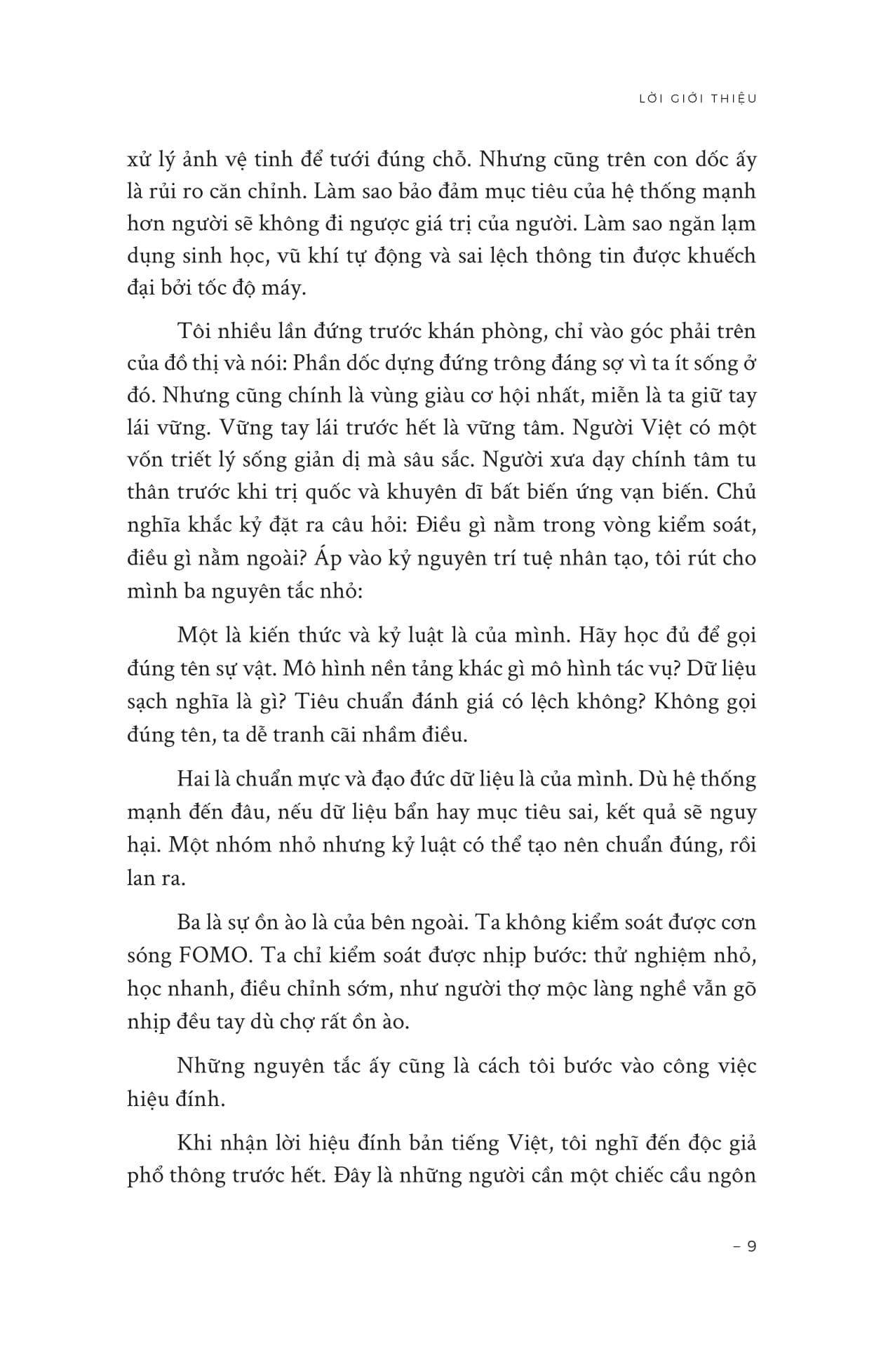 “Bước đột phá đầu tiên báo hiệu tiềm năng biến đổi triệt để của học sâu chính là việc AI chinh phục được trò chơi cờ vây. Cờ vây có số lượng các nước đi khả dĩ nhiều hơn hẳn cờ vua, và việc đánh giá sự hay-dở của một nước đi cũng khó hơn rất nhiều. Những phương pháp AI từng giúp đánh bại các đại kiện tướng cờ vua gần như không đem lại tiến triển gì khi áp dụng vào cờ vây. Ngay cả những chuyên gia lạc quan cũng cho rằng bài toán này chưa thể được giải cho đến sớm nhất là thập niên 2020. (Ví dụ, đến năm 2012, nhà tương lai học hàng đầu về AI Nick Bostrom vẫn dự đoán rằng phải đến khoảng năm 2022 AI mới có thể thành thạo cờ vây.)77 Vậy mà vào năm 2015-2016, công ty DeepMind, một công ty con của Alphabet đã phát triển AlphaGo sử dụng phương pháp “học sâu tăng cường”, trong đó, một mạng neuron lớn tự xử lý những ván đấu của chính mình và học hỏi từ các ván thắng, thua.78 Ban đầu, nó được huấn luyện bằng kho dữ liệu khổng lồ về các nước đi của con người, rồi sau đó tự chơi với chính mình vô số ván cho đến khi phiên bản AlphaGo Master đánh bại nhà vô địch cờ vây thế giới Kha Khiết.”
