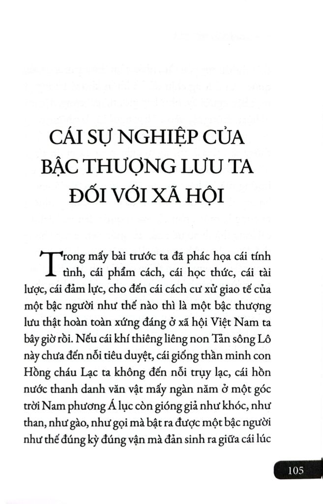 ...văn đề mà thổ lộ cái tư tưởng thuần túy cao thượng của mình, để mà truyền đạt cái học thức xem rộng biết nhiều của mình, để mà xoay xỏa với cái tình thế của bản quốc mình, để mà đối phó với cái cục diện của hiện thời mình, để mà chỉ đường dắt lỗi cho những công việc đòi hay dở, để mà bổ thiên cứu tệ cho những điều khuyết điểm quốc dân. Người ta vẫn thường nói: văn chương quan thế vận thịnh suy; đến lúc mà thiểu niên tử đệ trong nước mình nhờ sách vở của mình mà dại trở nên khôn, hèn trở nên hay, yếu trở nên mạnh, những đồng bào trong nước mình nhờ câu văn của mình mà kiến thức đương hẹp hòi hóa ra rộng rãi, tính nết đương xấu hóa tốt, phong tục đương dở hóa hay, đúng được cái câu sấm ngữ: vận mệnh nước mình sau này mà hay được là nhờ ở quốc văn, thì cái công nghiệp của các nhà trong văn giới ta thật không phải chỉ là công nghiệp “buôn văn bán chữ" như bây giờ, mà đối với xã hội ta thật có cái công nghiệp lập ngôn bất hủ vậy.