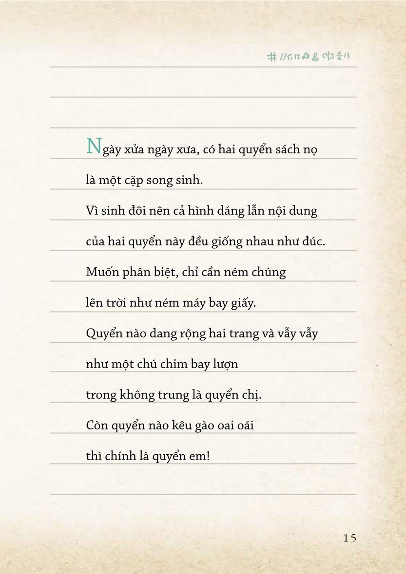 - Ngày xửa ngày xưa có quyển sách nọ trông thật dễ thương khi được đặt giữa một cánh đồng hoa tươi tắn. Khi nằm trên nền bê tông thì nó lại có vẻ cô đơn. Khi ở giữa rừng rậm thì nó trở nên hầm hố như một sinh vật hoang dã.
