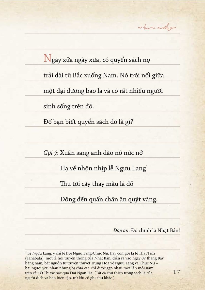 - Ngày xửa ngày xưa có quyển sách nọ trải dài từ Bắc xuống Nam. Nó trôi nổi giữa một đại dương bao la và có rất nhiều người sinh sống trên đó.