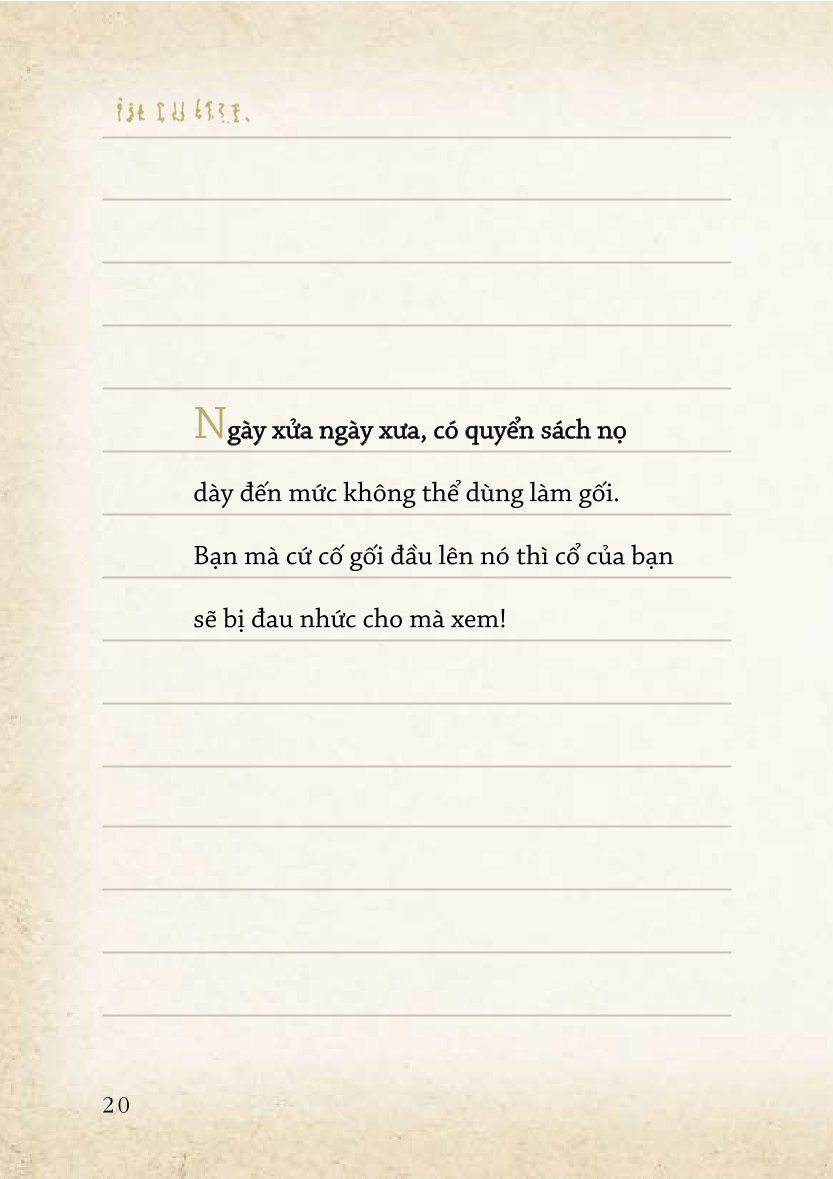 - Ngày xửa ngày xưa có quyển sách nọ vẫn chưa ra đời. Trong một căn phòng cũ kỹ của khu chung cư nhỏ, khi mọi người ở đó đã chìm vào giấc ngủ, một tiểu thuyết gia vẫn đang cặm cụi viết. Quyển sách ấy hiện chỉ tồn tại trong tâm trí tác giả. Những người xung quanh chẳng ai kỳ vọng gì cả. Thậm chí có người còn chê bai: “Chẳng bao giờ viết xong được đâu”.