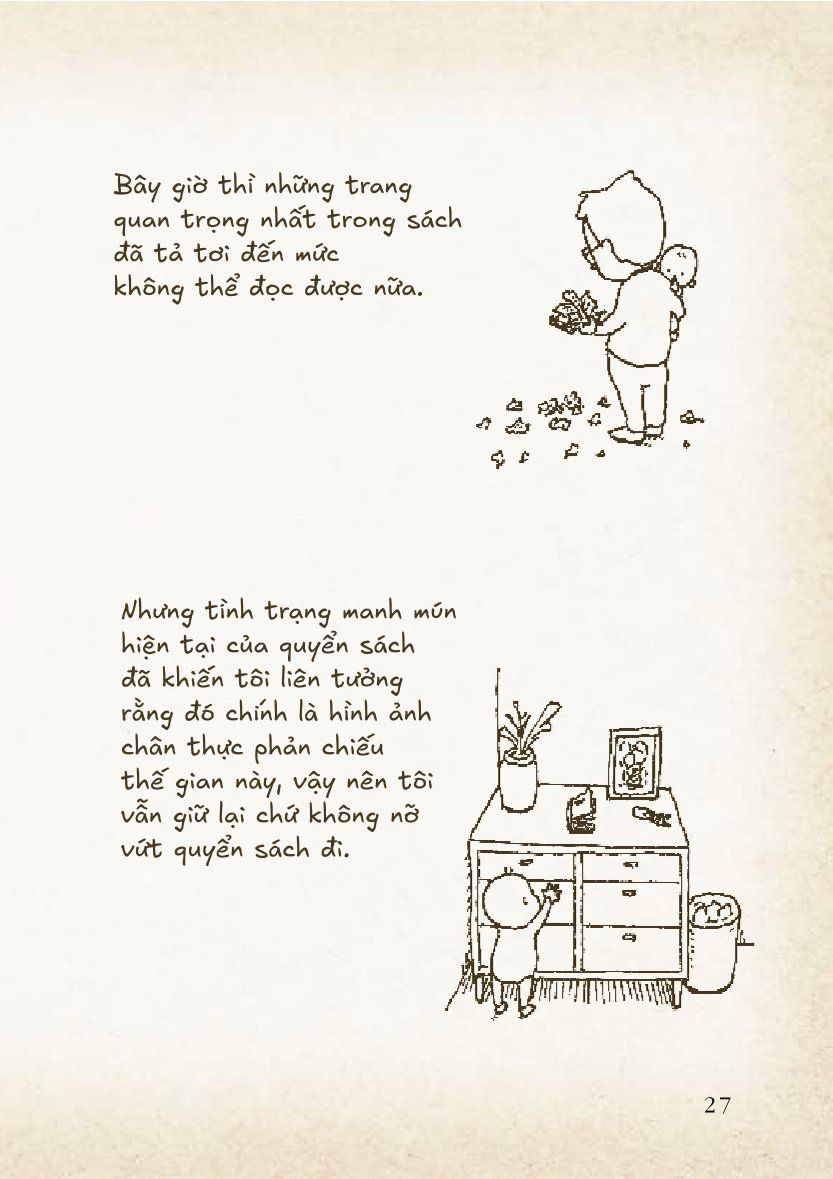 Nhưng tình trạng manh mún hiện tại của quyển sách đã khiến tôi liên tưởng rằng đó chính là hình ảnh chân thực phản chiếu thế gian này, vậy nên tôi vẫn giữ lại chứ không nỡ vứt quyển sách đi.