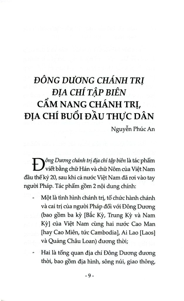 Đông Dương chánh trị địa chí tập biên là một tác phẩm ngắn gọn, súc tích, rõ ràng cách tổ chức hành chánh, chức năng và quyền hạn của quan chức, quy hoạch, nghị định quan trọng đối với việc tiến hành các chánh sách mang tính hành chánh của các xứ. Quyển sách này giúp cho người đọc nắm bắt nhanh được quy mô của nước Pháp ở Đông Dương, không chỉ ở thời điểm nó ra đời, mà còn giúp ích cho giới nghiên cứu lịch sử xã hội Việt Nam đầu thế kỷ 20, ngay sau khi nước Việt Nam rơi vào tay người Pháp. Tập sách nhỏ này có chức năng như một cuốn cẩm nang, đồng thời cũng là một văn bản hợp thức hóa, mang tính tuyên bố đối với chính sách cai trị của Pháp đối với các xứ trong khu vực gọi là Đông Dương (Indochine).