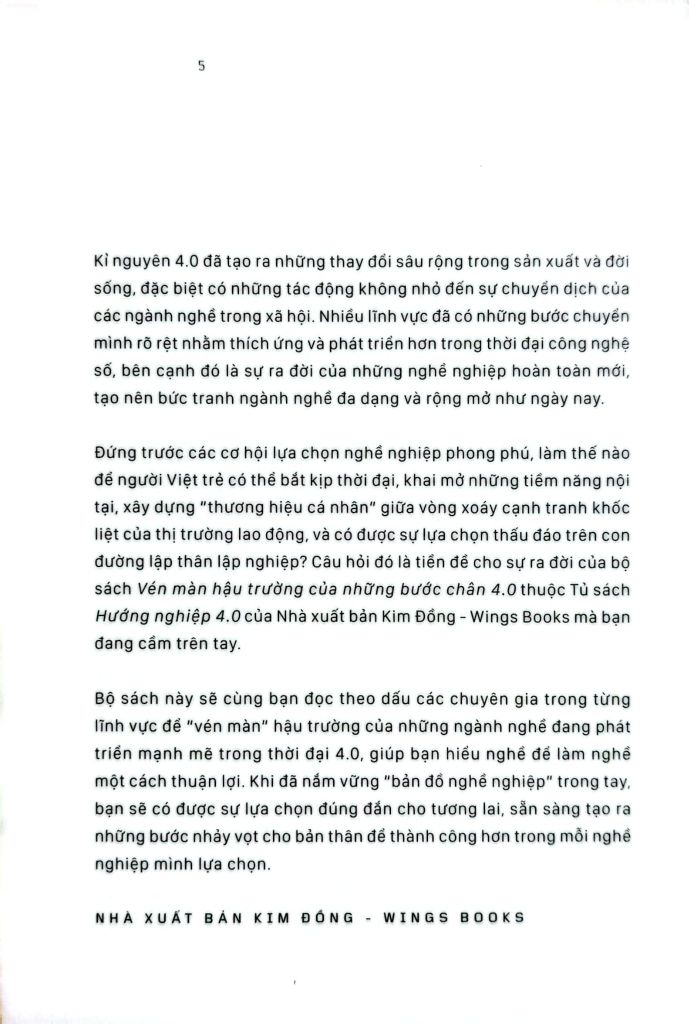 Kỉ nguyên 4.0 đã tạo ra những thay đổi sâu rộng trong sản xuất và đời sống, đặc biệt có những tác động không nhỏ đến sự chuyển dịch của các ngành nghề trong xã hội. Đứng trước các cơ hội lựa chọn nghề nghiệp phong phú, làm thế nào để người Việt trẻ có thể bắt kịp thời đại, khai mở những tiềm năng nội tại, xây dựng “thương hiệu cá nhân” giữa vòng xoáy cạnh tranh khốc liệt của thị trường lao động, và có được sự lựa chọn thấu đáo trên con đường lập thân lập nghiệp?