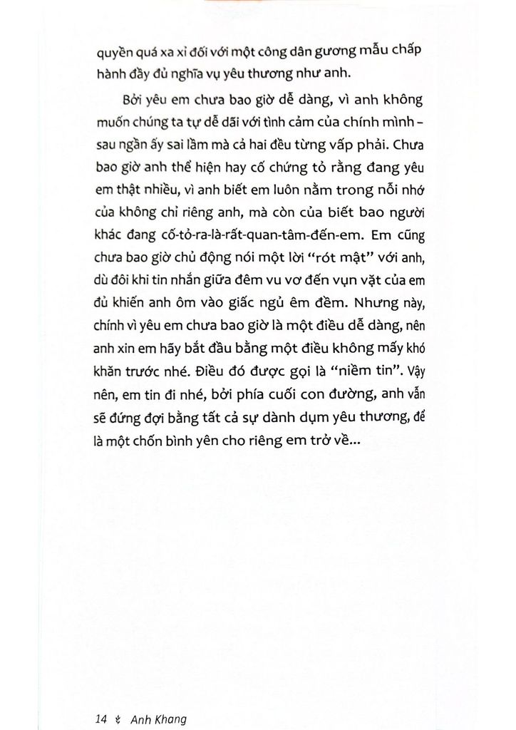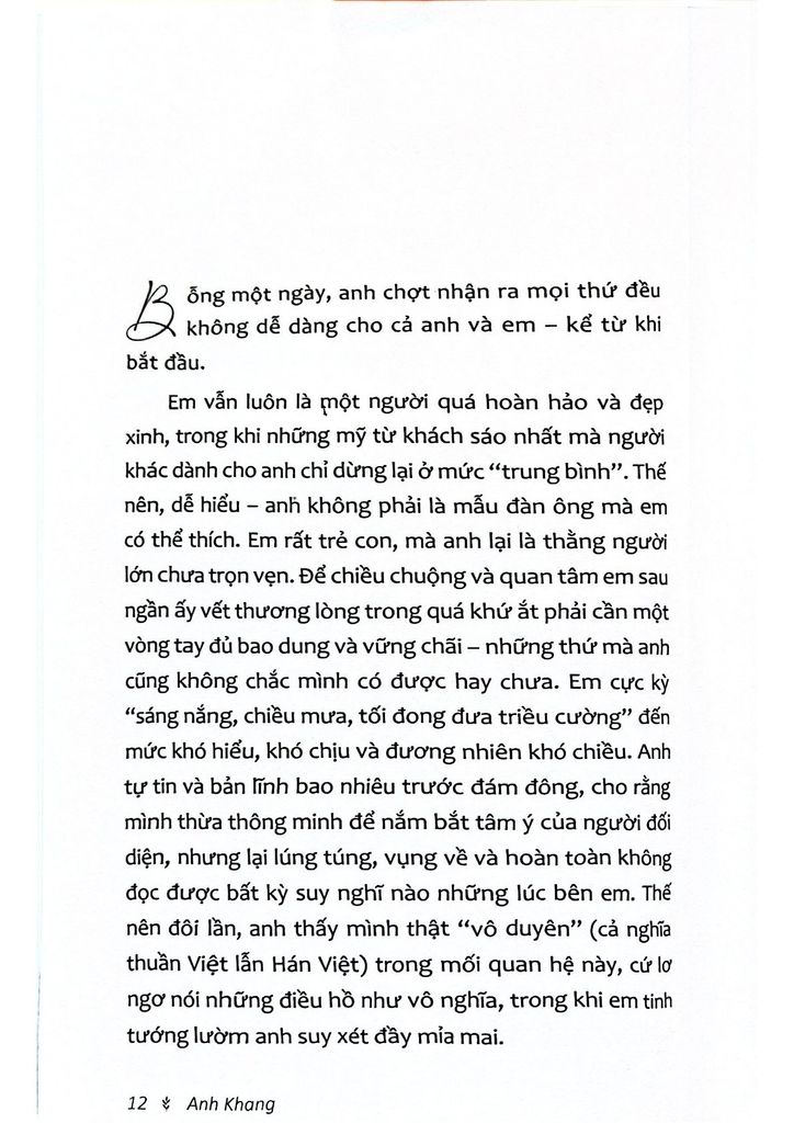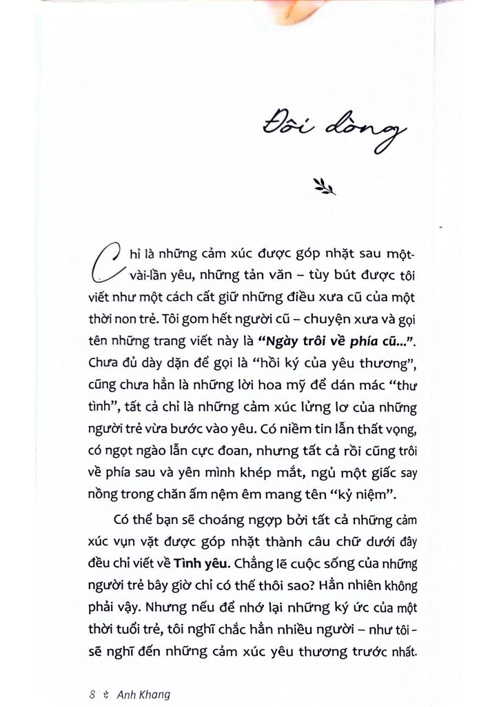 Đại diện cho thế hệ thanh niên trẻ tuổi, Anh Khang là một trong những cây viết tài năng thể hiện rõ những cảm nhận sâu sắc cùng những cảm quan nghệ thuật tinh tế. Sở dĩ những trang viết này gần gũi, dễ được các bạn trẻ đón nhận vì tác giả đã nói thay những cảm xúc của họ về người cũ chuyện xưa, điều mà ai cũng từng có và đánh mất trong đời.
