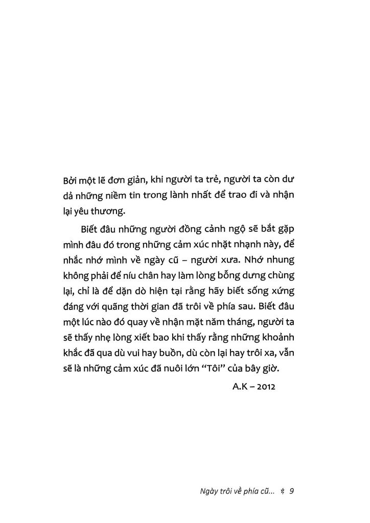 Ngày trôi về phía cũ... – tác phẩm đầu tay của tác giả Anh Khang – dễ làm người ta liên tưởng đến những điều đã qua với một chút hoặc rất nhiều tiếc nuối... Dù chỉ xoay quanh những cảm xúc tình yêu nhưng Ngày trôi về phía cũ... lại không hề bi lụy và não nề. Chọn cách nhìn thẳng vào những nỗi đau, những ngày vất vả đi qua một cuộc tình cũ, Khang viết như một cách trải lòng và tìm sự thấu cảm từ những độc giả của mình.