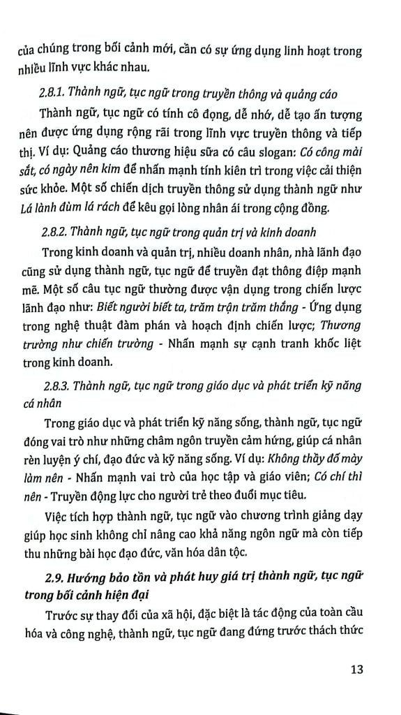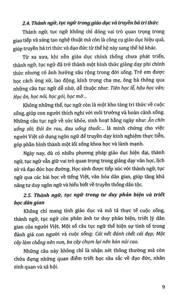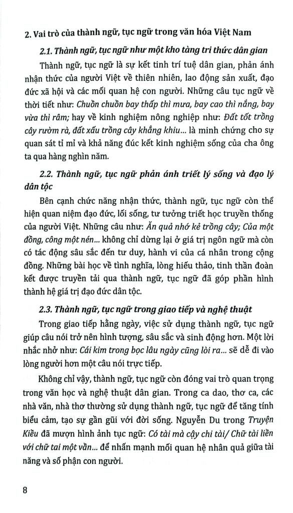Từ thuở xa xưa, thông qua các câu thành ngữ, tục ngữ, người Việt đã đúc kết quy luật tự nhiên, truyền tải tri thức về cuộc sống, đồng thời giáo dục đạo đức, lối sống, cách ứng xử giữa con người với con người. Những câu nói giản dị như “Uống nước nhớ nguồn”, “Lá lành đùm lá rách” hay “Có công mài sắt, có ngày nên kim” vừa truyền dạy bài học về lòng biết ơn, tinh thần tương trợ và ý chí kiên trì vừa góp phần hình thành tư duy, phẩm hạnh cho nhiều thế hệ. Thành ngữ, tục ngữ không chỉ tồn tại trong đời sống thường nhật mà còn xuất hiện trong văn học dân gian, ca dao, thơ ca và cả trong giao tiếp hiện đại, làm cho câu chữ trở nên sinh động, uyển chuyển và có chiều sâu ý nghĩa.
