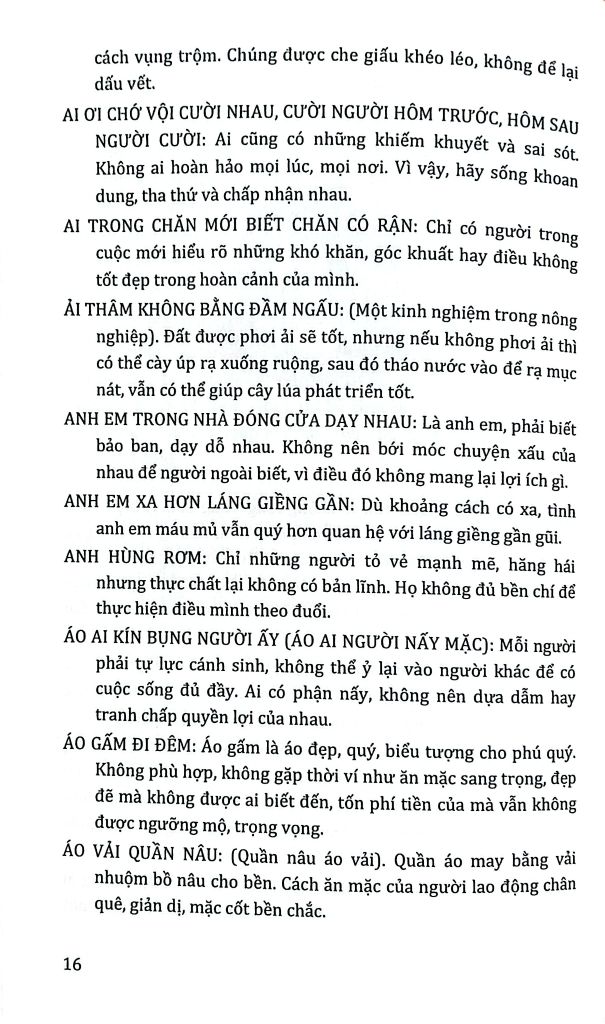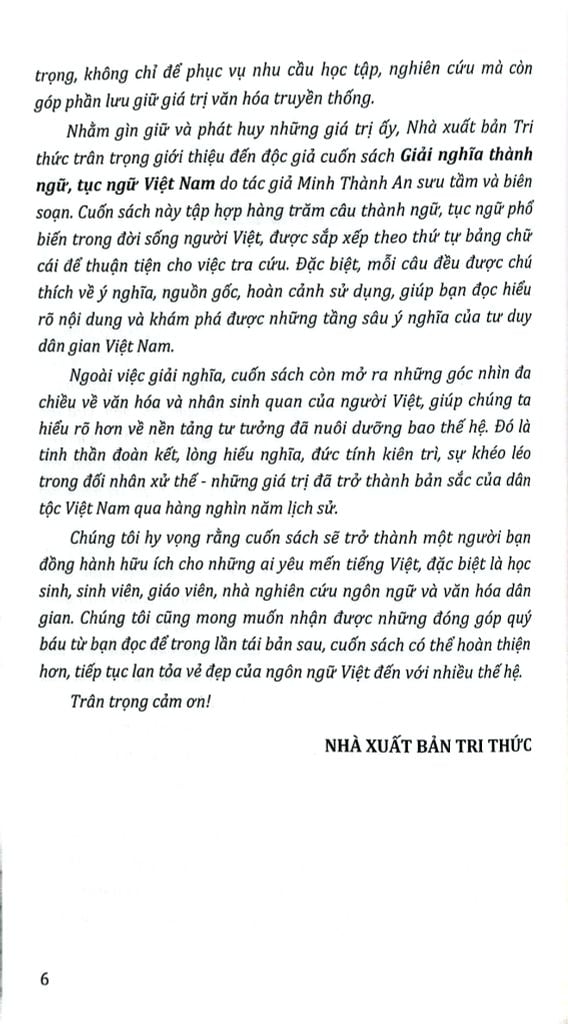Nhằm gìn giữ và phát huy những giá trị ấy, Nhà xuất bản Trị thức trân trọng giới thiệu đến độc giả cuốn sách Giải nghĩa thành ngữ, tục ngữ Việt Nam do tác giả Minh Thành An sưu tầm và biên soạn. Cuốn sách này tập hợp hàng trăm câu thành ngữ, tục ngữ phổ biến trong đời sống người Việt, được sắp xếp theo thứ tự bảng chữ cái để thuận tiện cho việc tra cứu. Đặc biệt, mỗi câu đều được chú thích về ý nghĩa, nguồn gốc, hoàn cảnh sử dụng, giúp bạn đọc hiểu rõ nội dung và khám phá được những tầng sâu ý nghĩa của tư duy dân gian Việt Nam.