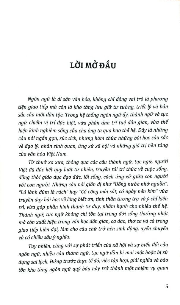 Tuy nhiên, cùng với sự phát triển của xã hội và sự biến đổi của ngôn ngữ, nhiều câu thành ngữ, tục ngữ dần bị mai một hoặc bị sử dụng sai lệch. Đứng trước thực tế đó, việc tập hợp, giải nghĩa và bảo tồn kho tàng ngôn ngữ quý báu này trở thành một nhiệm vụ quan trọng, không chỉ để phục vụ nhu cầu học tập, nghiên cứu mà còn góp phần lưu giữ giá trị văn hóa truyền thống.