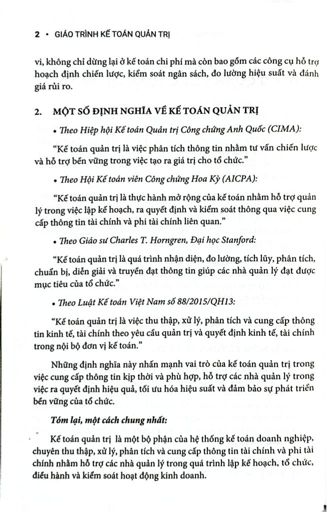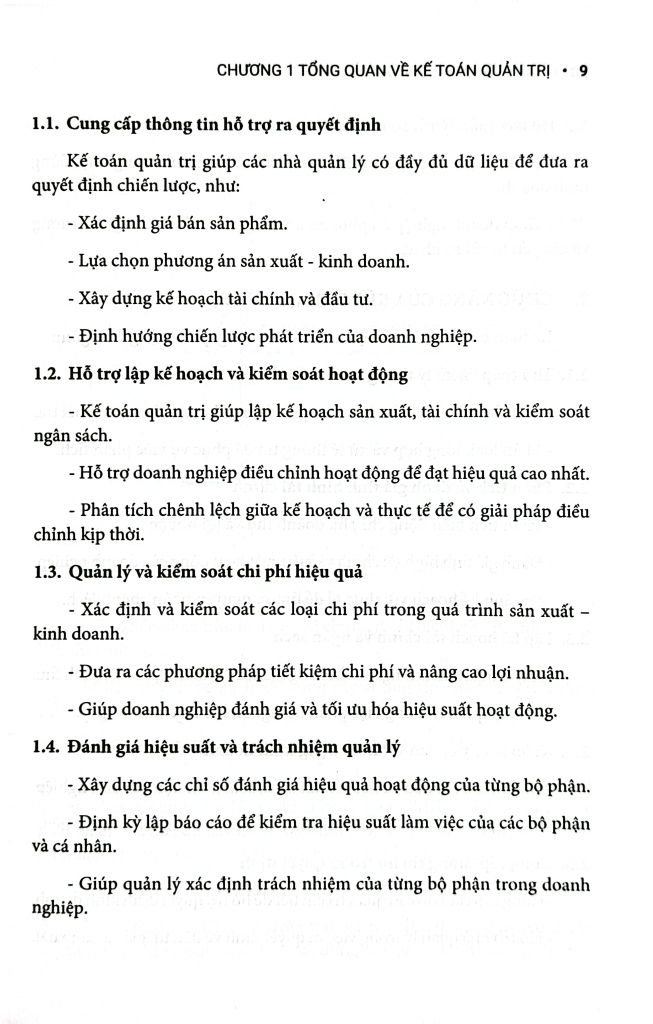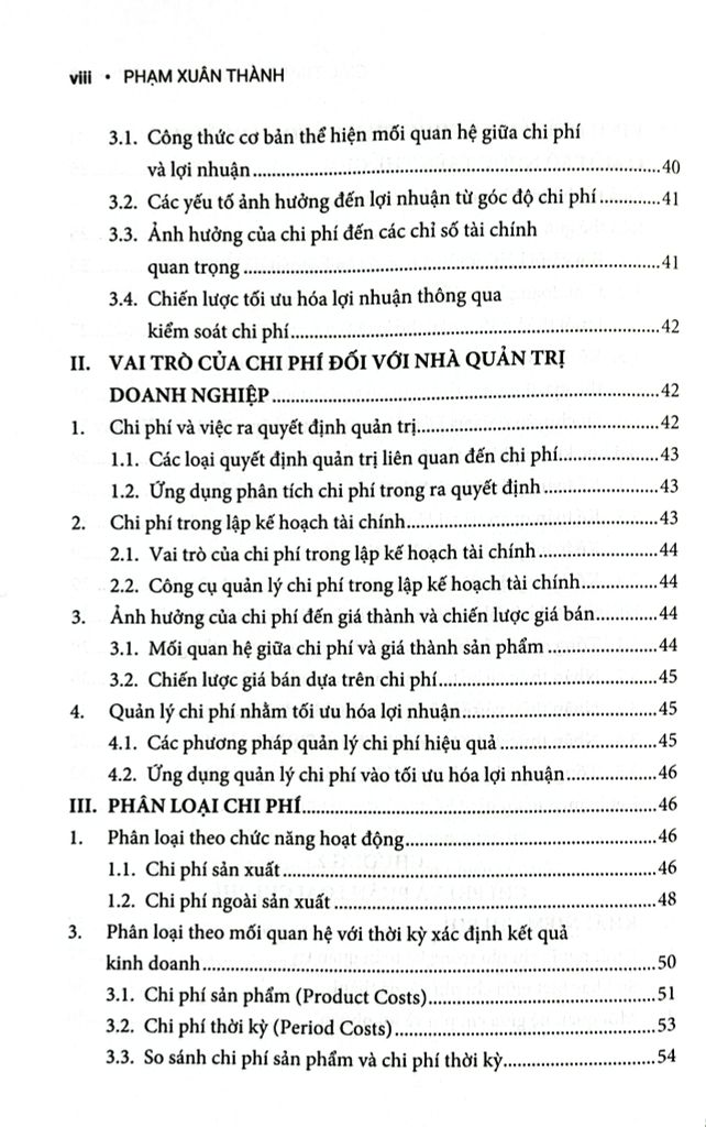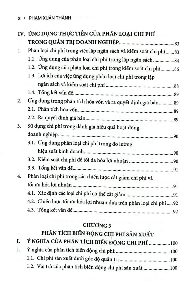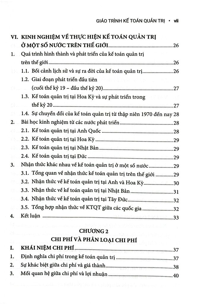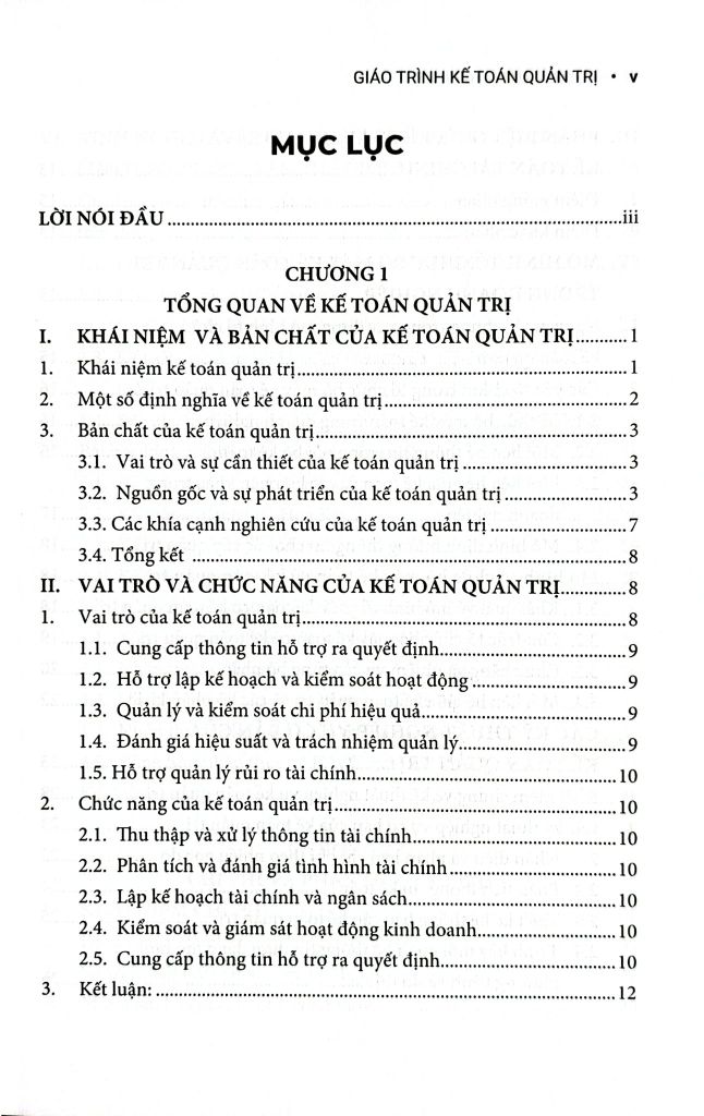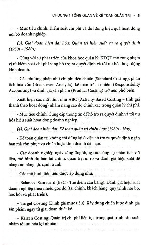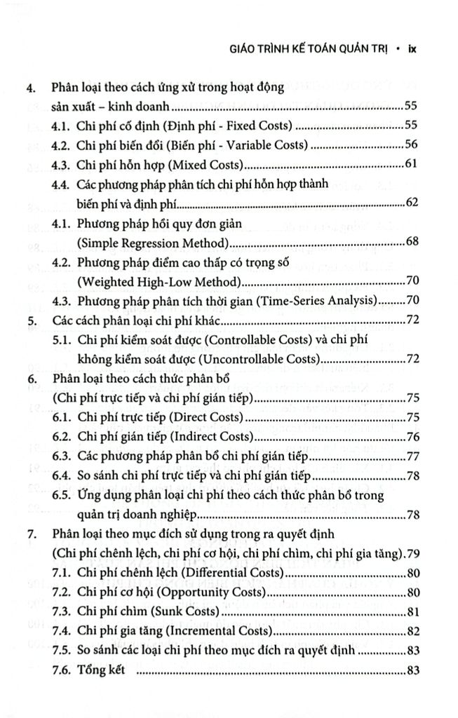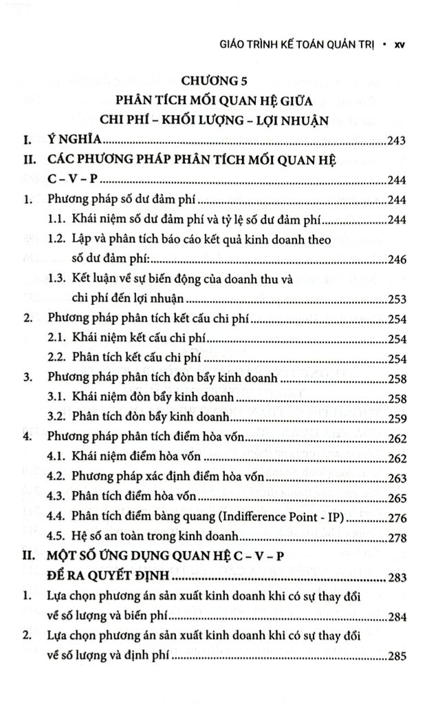 Chương 2 đến Chương 5 trình bày về chi phí, phương pháp phân loại và phân tích, hệ thống tính giá thành sản phẩm, và mối quan hệ giữa chi phí – sản lượng – lợi nhuận (C-V-P).