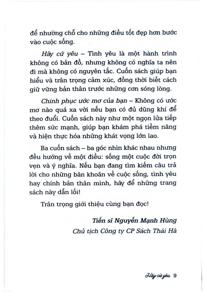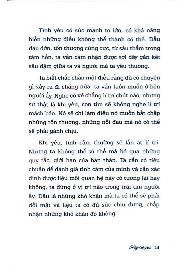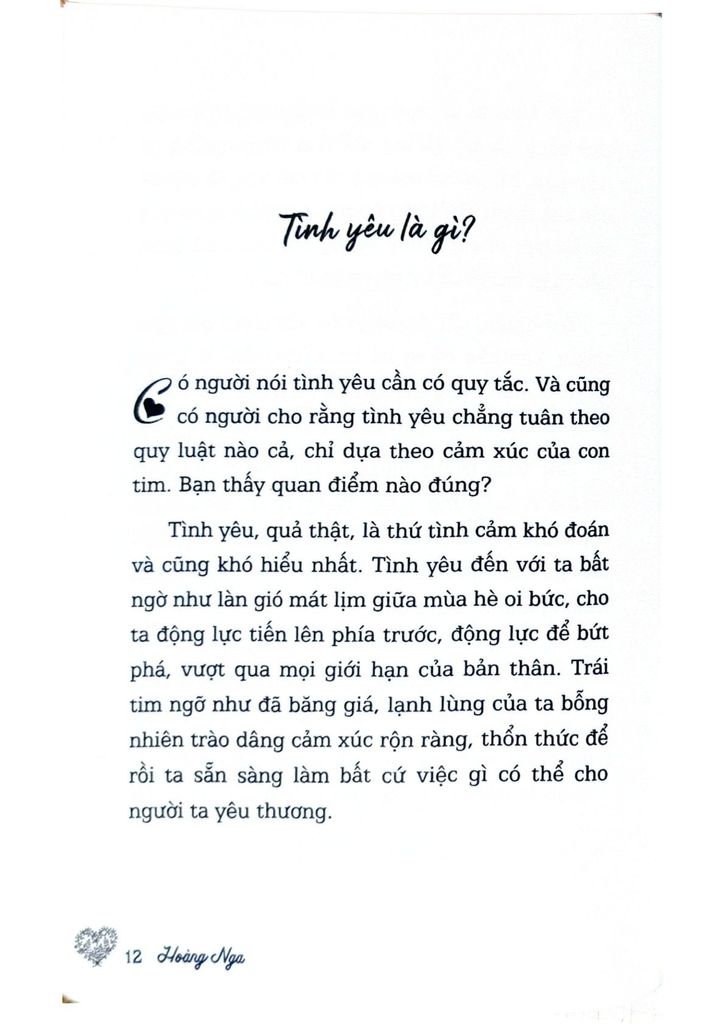 Cuốn sách Hãy cứ yêu của tác giả Hoàng Nga sẽ cung cấp cho bạn những nguyên tắc cần phải tuân thủ khi yêu, giúp bạn không bị tổn thương bởi những nỗi đau không cần thiết. Tác giả Hoàng Nga sẽ cùng bạn đi sâu vào nhiều khía cạnh khác nhau của tình yêu và mối quan hệ dưới góc nhìn suy tư, đa chiều. Cuốn sách không chỉ đơn thuần là đưa ra những lời khuyên mà còn đi sâu vào phân tích tâm lý, hành vi và những yếu tố ảnh hưởng tới mối quan hệ giúp bạn đọc hiểu rõ hơn về bản thân, đối phương, và xây dựng một mối quan hệ hạnh phúc, bền vững.