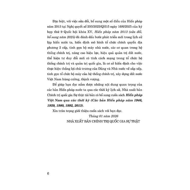 Để giúp bạn đọc nắm được những nội dung quan trọng của các bản Hiến pháp nước ta qua các thời kỳ lịch sử, Nhà xuất bản Chính trị quốc gia Sự thật tái bản có bổ sung cuốn sách Hiến pháp Việt Nam qua các thời kỳ (Các bản Hiến pháp năm 1946,1959, 1980, 1992, 2013).