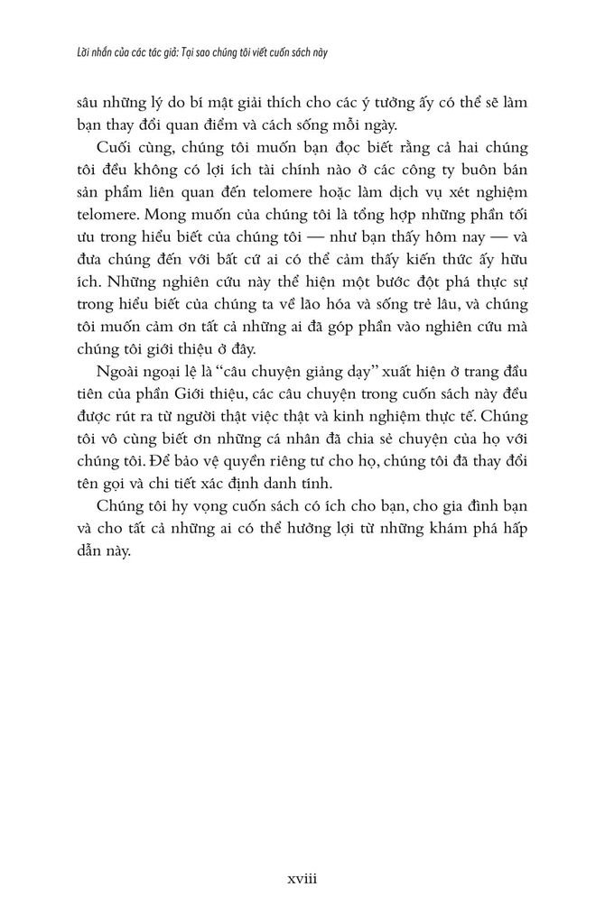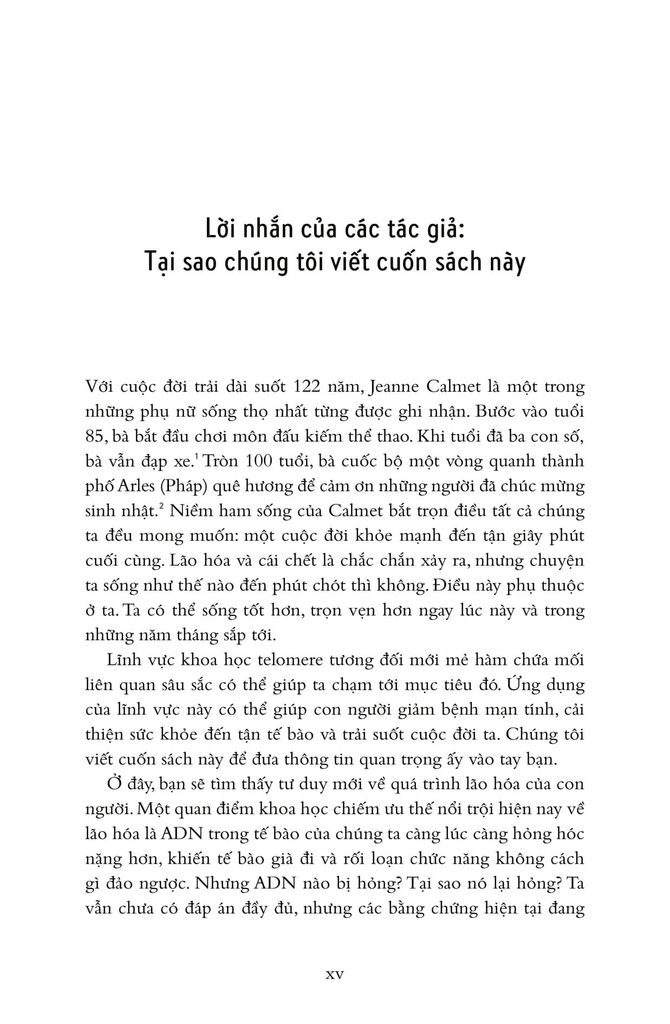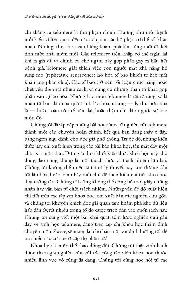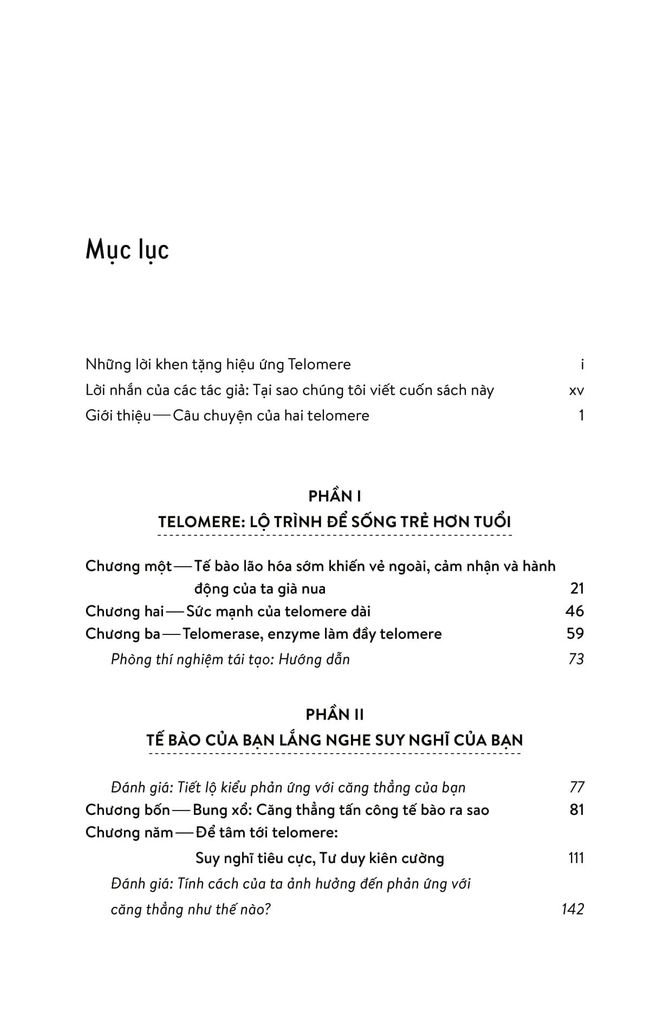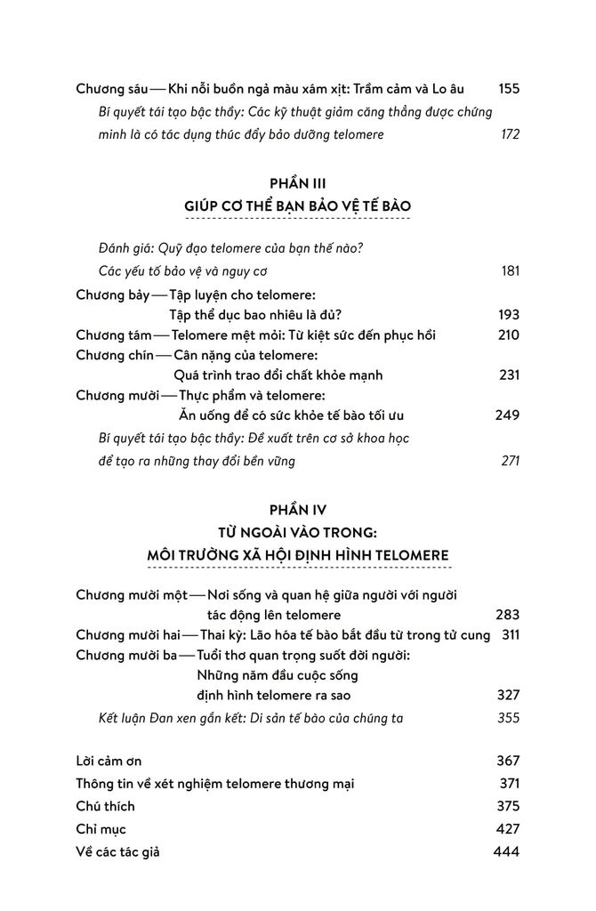 Từ đó, hai tác giả nói về chuyện sống lâu hơn, khỏe mạnh hơn và trẻ trung hơn bằng cách bảo dưỡng tolomere sao cho trì hoãn quá trình hao mòn chậm hết mức có thể. Ước mơ lớn lao bao đời của nhân loại về trường xuân bất lão được viết hết sức hấp dẫn. Sợi tolomere vi diệu được hai tác giả soi từ đủ mọi tác nhân trong cuộc sống: stress ăn mòn tolomere thế nào, suy nghĩ tiêu cực đốt nhanh tolomere ra sao, rồi thì trầm cảm, lo âu... Nghệ thuật sống trở thành nghệ thuật nuôi dưỡng, chăm sóc và cả dạy dỗ tolomere trong cơ thể! Hơn cả nghệ thuật sống cho cấp độ cơ bản là sinh học tế bào, cuốn sách này nói về thuật dưỡng thân có căn cứ khoa học.