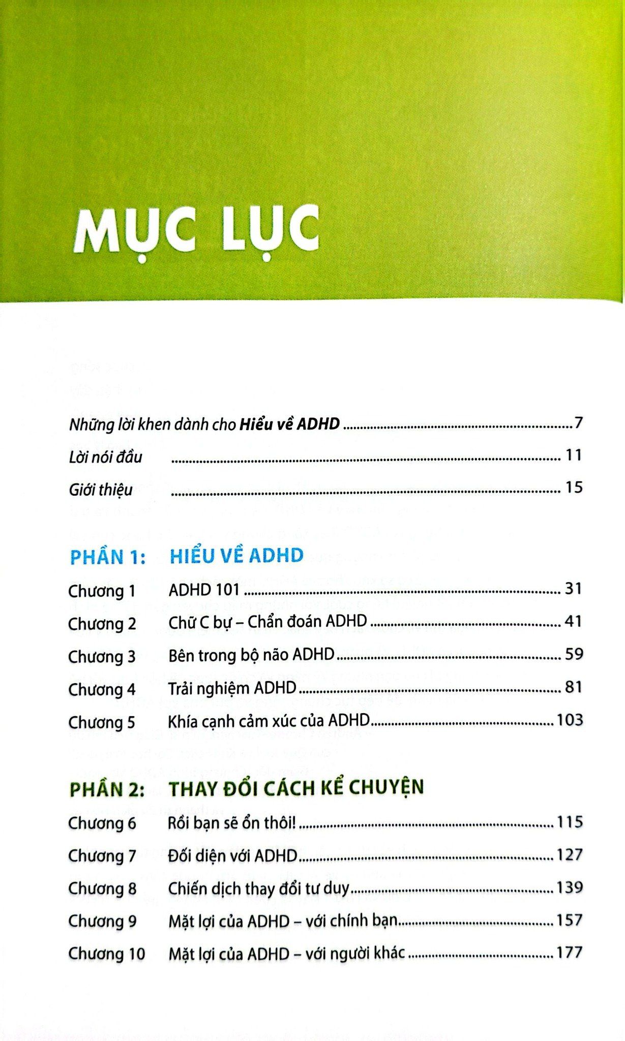 Nội dung sách được chia thành ba phần. Ở phần đầu, Penn và Kim giải thích ADHD là gì, nguyên nhân từ đâu, biểu hiện ra sao ở trẻ em, người lớn, phụ nữ và các nhóm khác nhau. Bạn sẽ nhận ra những hiểu lầm phổ biến – như việc cho rằng ADHD đồng nghĩa với “thiếu tập trung” hay “lười biếng”, thực chất chỉ là kết quả của sự thiếu hiểu biết về cách não bộ ADHD xử lý thông tin. Phần hai tập trung vào việc thay đổi câu chuyện mà chúng ta vẫn thường kể về ADHD. Thay vì chỉ nói về khuyết điểm và hạn chế, tác giả chỉ ra những khía cạnh tích cực, cả trong công việc, sáng tạo, mối quan hệ và cuộc sống. Cuối cùng, phần ba đưa ra những chiến lược thực tiễn: cách quản lý năng lượng, xây dựng thói quen, điều chỉnh môi trường sống, hoàn thành mục tiêu và chăm sóc bản thân.