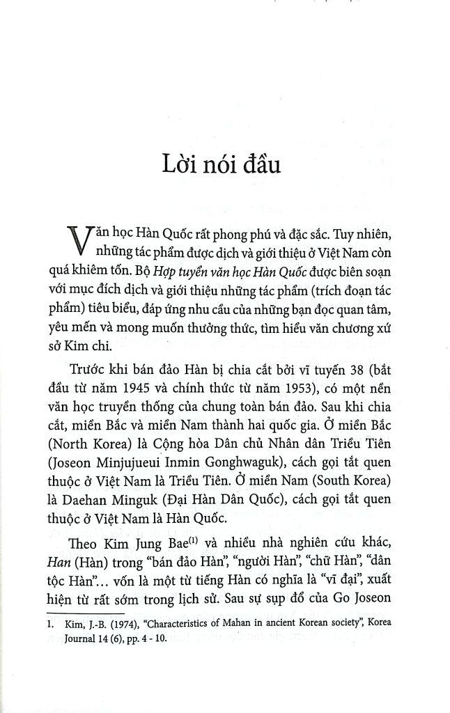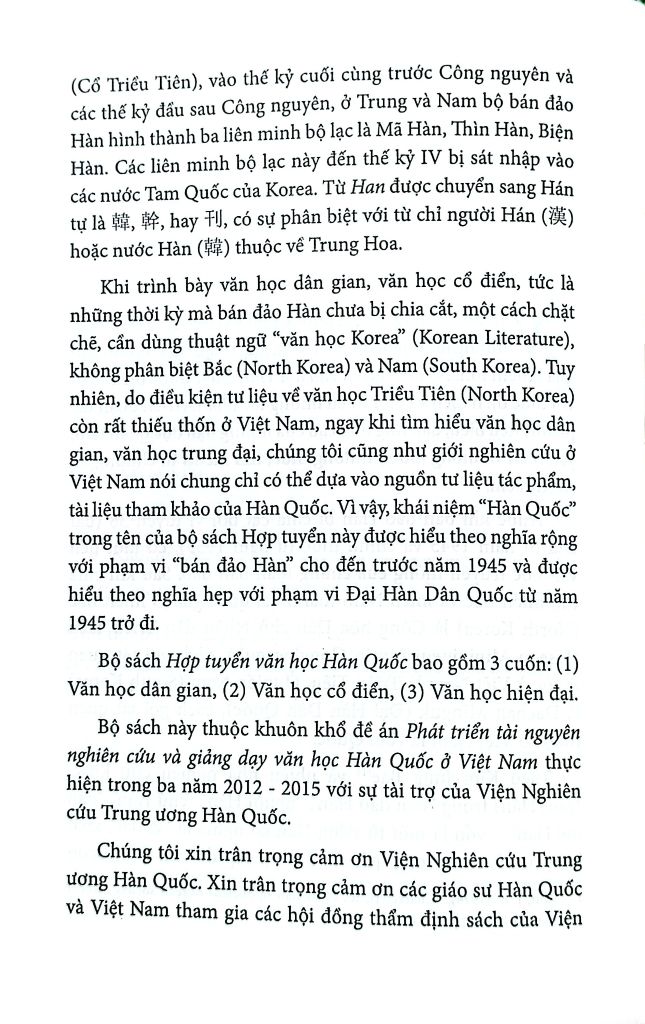 Khi trình bày văn học dân gian, văn học cổ điển, tức là những thời kỳ mà bán đảo Hàn chưa bị chia cắt, một cách chặt chẽ, cần dùng thuật ngữ “văn học Korea” (Korean Literature), không phân biệt Bắc (North Korea) và Nam (South Korea). Tuy nhiên, do điều kiện tư liệu về văn học Triều Tiên (North Korea) còn rất thiếu thốn ở Việt Nam, ngay khi tìm hiểu văn học dân gian, văn học trung đại, chúng tôi cũng như giới nghiên cứu ở Việt Nam nói chung chỉ có thể dựa vào nguồn tư liệu tác phẩm, tài liệu tham khảo của Hàn Quốc. Vì vậy, khái niệm “Hàn Quốc” trong tên của bộ sách Hợp tuyển này được hiểu theo nghĩa rộng với phạm vi “bán đảo Hàn” cho đến trước năm 1945 và được hiểu theo nghĩa hẹp với phạm vi Đại Hàn Dân Quốc từ năm 1945 trở đi.