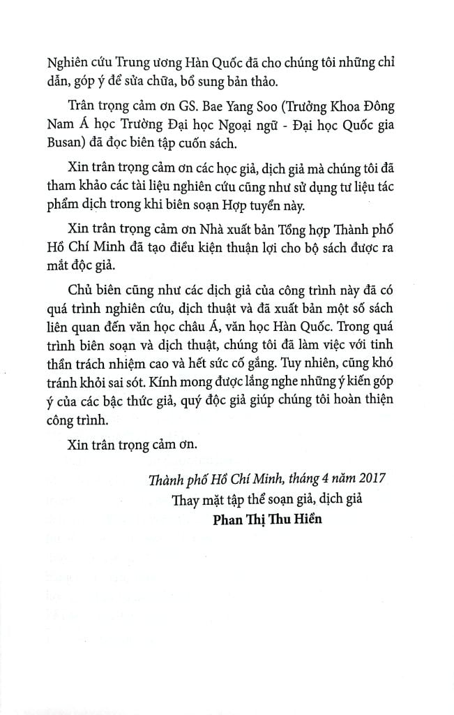 Văn học Hàn Quốc rất phong phú và đặc sắc. Tuy nhiên, những tác phẩm được dịch và giới thiệu ở Việt Nam còn quá khiêm tốn. Bộ Hợp tuyển văn học Hàn Quốc được biên soạn với mục đích dịch và giới thiệu những tác phẩm (trích đoạn tác phẩm) tiêu biểu, đáp ứng nhu cầu của bạn đọc quan tâm, yêu mến và mong muốn thưởng thức, tìm hiểu văn chương xứ sở Kim chi.