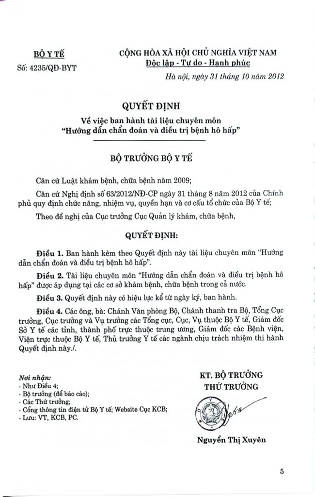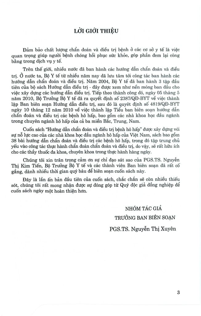 Trên thế giới, nhiều nước đã ban hành các hướng dẫn chẩn đoán và điều trị. ở nước ta, Bộ Y tế từ nhiều năm nay đã lưu tâm tối công tác ban hành các hướng dẫn chẩn đoán và điều trị. Năm 2004, Bộ Y tế đã ban hành 3 tập đầu tiên của bộ sách Hướng dẫn điều trị - đây được xem như nền móng ban đầu cho việc xây dựng các hướng dẫn điều trị. Tiếp theo thành công đó, ngày 05 tháng 5 năm 2010, Bộ Trưởng Bộ Y tế đã ra quyết định số 2387/QĐ-BYT về việc thành lập Ban biên soạn Hướng dẫn điều trị, sau đó là quyết định số 4819/QĐ-BYT ngày 10 tháng 12 năm 2010 về việc thành lập Tiểu ban biên soạn hướng dẫn chẩn đoán và điều trị các bệnh hô hấp, bao gồm các nhà khoa học đầu ngành trong chuyên ngành hô hấp của cả ba miền Bắc, Trung, Nam.